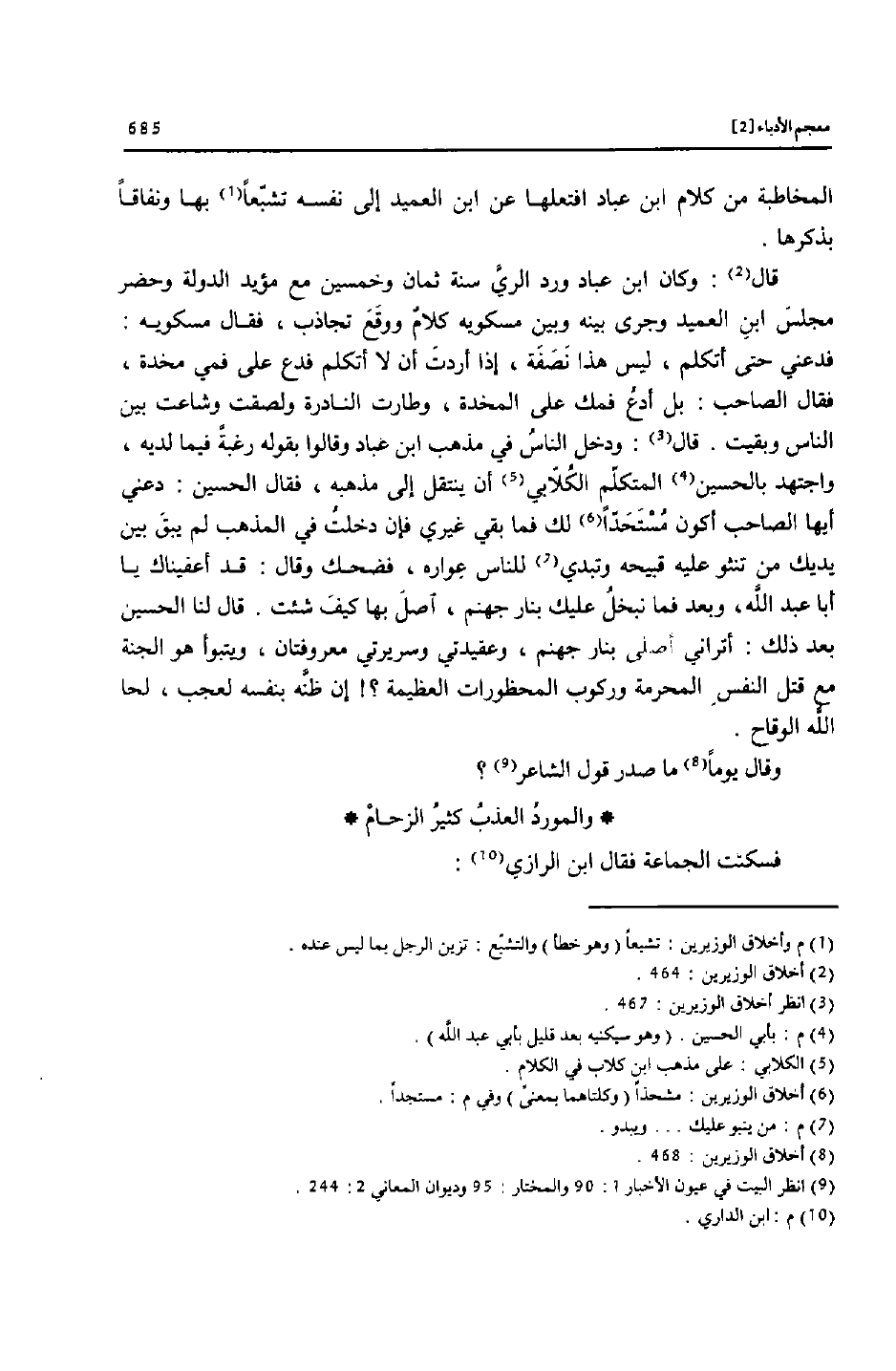 فدعني حتى أتكلم، ليس هذا نصفة، إذا أردت أن لا أتكلم فدع على فمي مخدة، فقال الصاحب: بل أدع فمك على المخدة، وطارت النادرة ولصقت وشاعت بين الناس وبقيت. قال «3» : ودخل الناس في مذهب ابن عباد وقالوا بقوله رغبة فيما لديه، واجتهد بالحسين «4» المتكلّم الكلّابي «5» أن ينتقل إلى مذهبه، فقال الحسين: دعني أيها الصاحب أكون مستحدّا «6» لك فما بقي غيري فإن دخلت في المذهب لم يبق بين يديك من تنثو عليه قبيحه وتبدي «7» للناس عواره، فضحك وقال: قد أعفيناك يا أبا عبد الله، وبعد فما نبخل عليك بنار جهنم، اصل بها كيف شئت. قال لنا الحسين بعد ذلك: أتراني أصلى بنار جهنم، وعقيدتي وسريرتي معروفتان، ويتبوأ هو الجنة مع قتل النفس المحرمة وركوب المحظورات العظيمة؟! إن ظنّه بنفسه لعجب، لحا الله الوقاح.