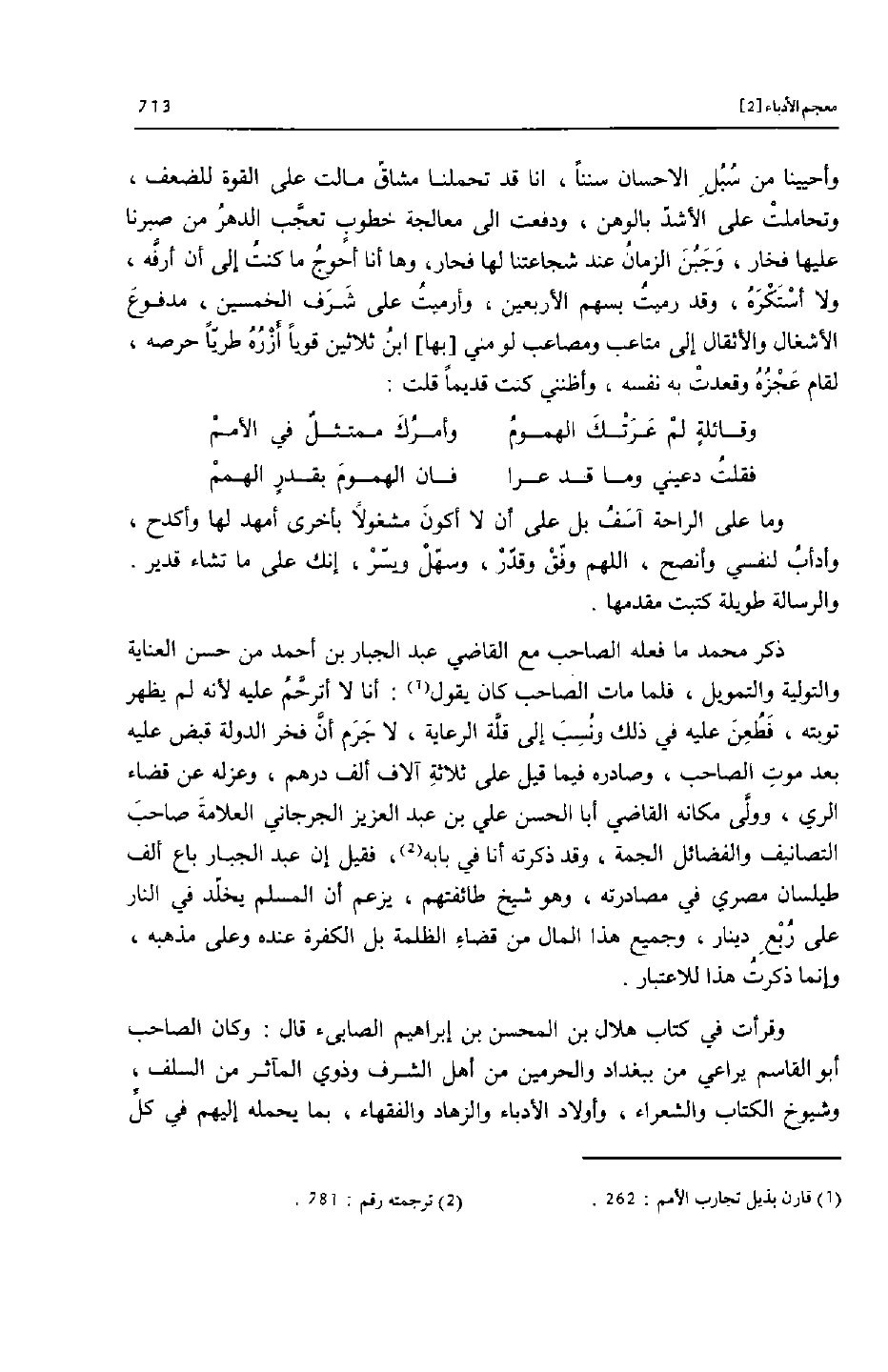 ذكر محمد ما فعله الصاحب مع القاضي عبد الجبار بن أحمد من حسن العناية والتولية والتمويل، فلما مات الصاحب كان يقول «1» : أنا لا أترحّم عليه لأنه لم يظهر توبته، فطعن عليه في ذلك ونسب إلى قلّة الرعاية، لا جرم أنّ فخر الدولة قبض عليه بعد موت الصاحب، وصادره فيما قيل على ثلاثة آلاف ألف درهم، وعزله عن قضاء الري، وولّى مكانه القاضي أبا الحسن علي بن عبد العزيز الجرجاني العلامة صاحب التصانيف والفضائل الجمة، وقد ذكرته أنا في بابه «2» ، فقيل إن عبد الجبار باع ألف طيلسان مصري في مصادرته، وهو شيخ طائفتهم، يزعم أن المسلم يخلّد في النار على ربع دينار، وجميع هذا المال من قضاء الظلمة بل الكفرة عنده وعلى مذهبه، وإنما ذكرت هذا للاعتبار.
