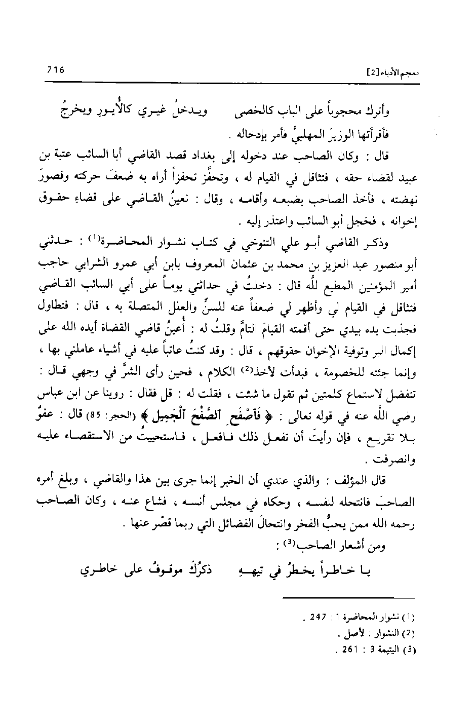 قال المؤلف: والذي عندي أن الخبر إنما جرى بين هذا والقاضي، وبلغ أمره الصاحب فانتحله لنفسه، وحكاه في مجلس أنسه، فشاع عنه، وكان الصاحب رحمه الله ممن يحبّ الفخر وانتحال الفضائل التي ربما قصّر عنها.