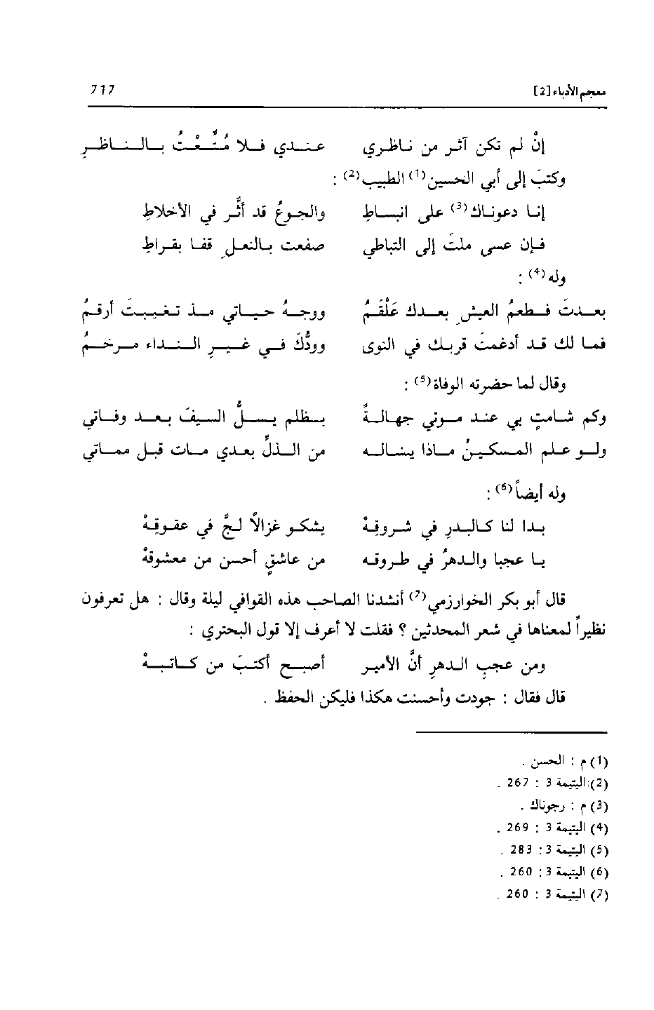 قال أبو بكر الخوارزمي «7» أنشدنا الصاحب هذه القوافي ليلة وقال: هل تعرفون نظيرا لمعناها في شعر المحدثين؟ فقلت لا أعرف إلا قول البحتري: