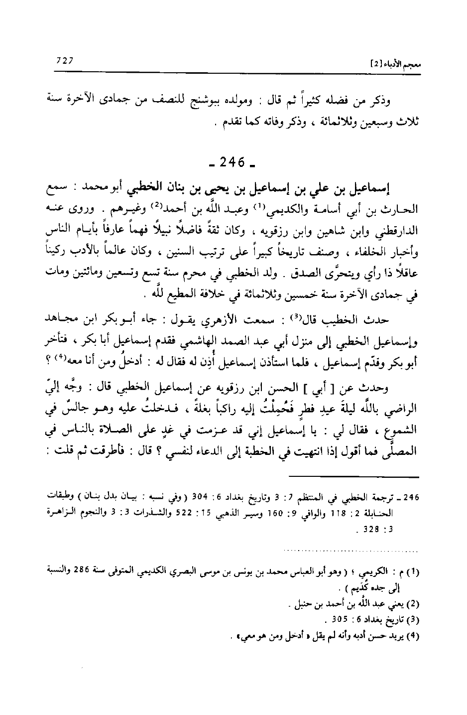 [246]- ترجمة الخطبي في المنتظم 7: 3 وتاريخ بغداد 6: 304 (وفي نسبه: بيان بدل بنان) وطبقات الحنابلة 2: 118 والوافي 9: 160 وسير الذهبي 15: 522 والشذرات 3: 3 والنجوم الزاهرة 3: 328.