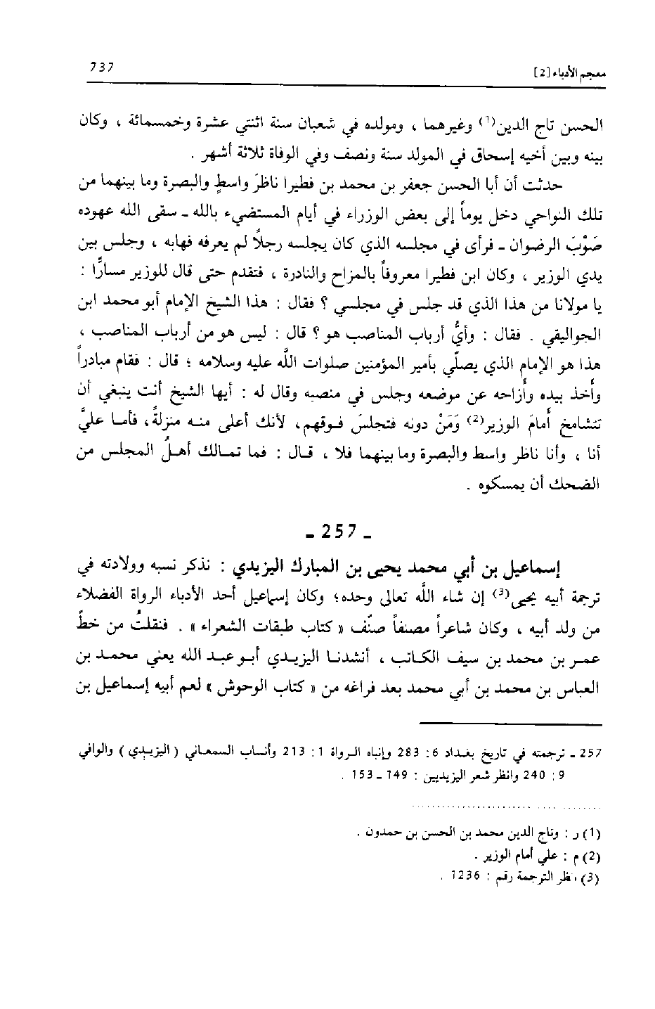 [257]- ترجمته في تاريخ بغداد 6: 283 وإنباه الرواة 1: 213 وأنساب السمعاني (اليزيدي) والوافي 9: 240 وانظر شعر اليزيديين: 149- 153.
