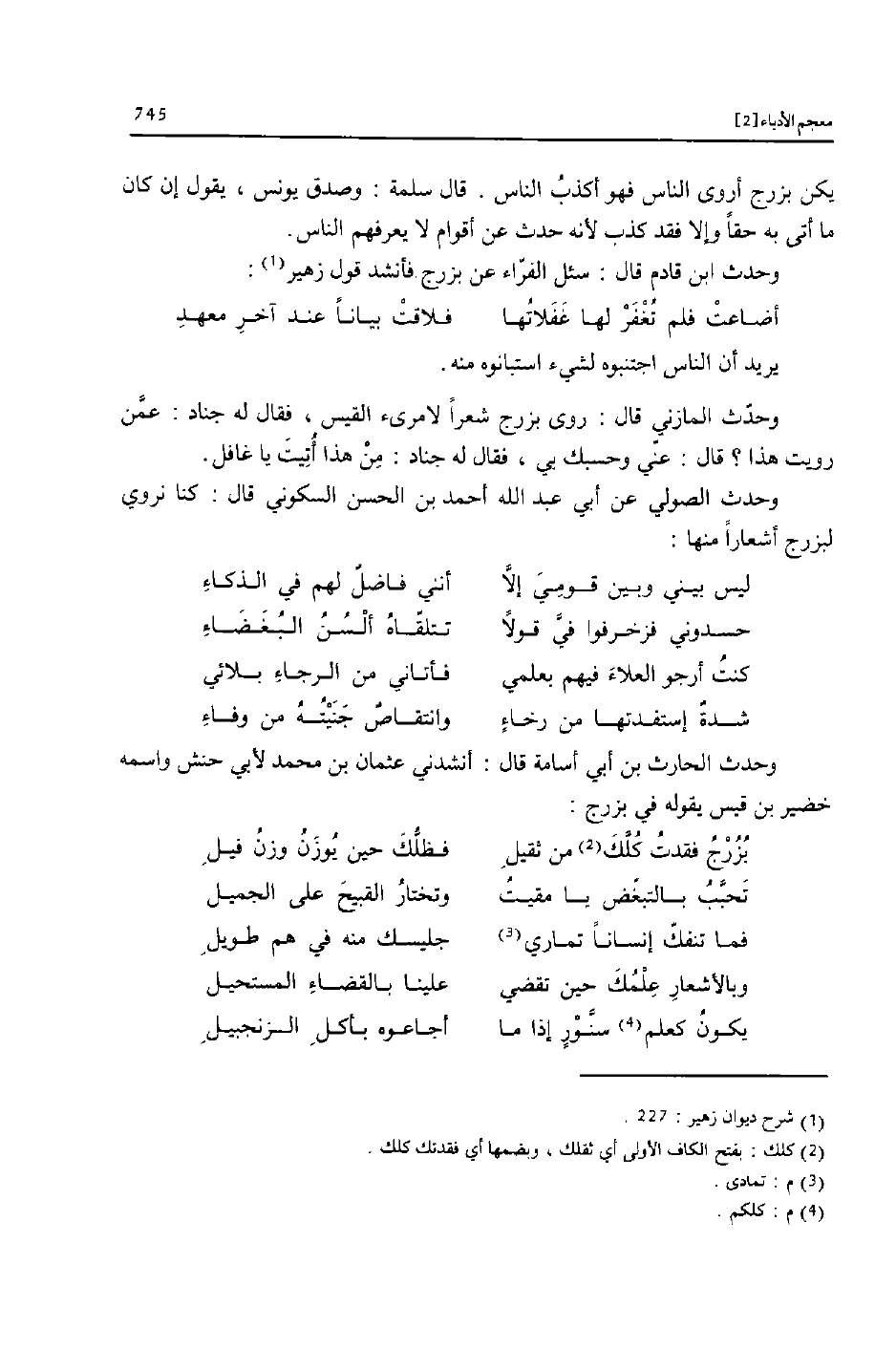 وحدث ابن قادم قال: سئل الفرّاء عن بزرج فأنشد قول زهير «1» :