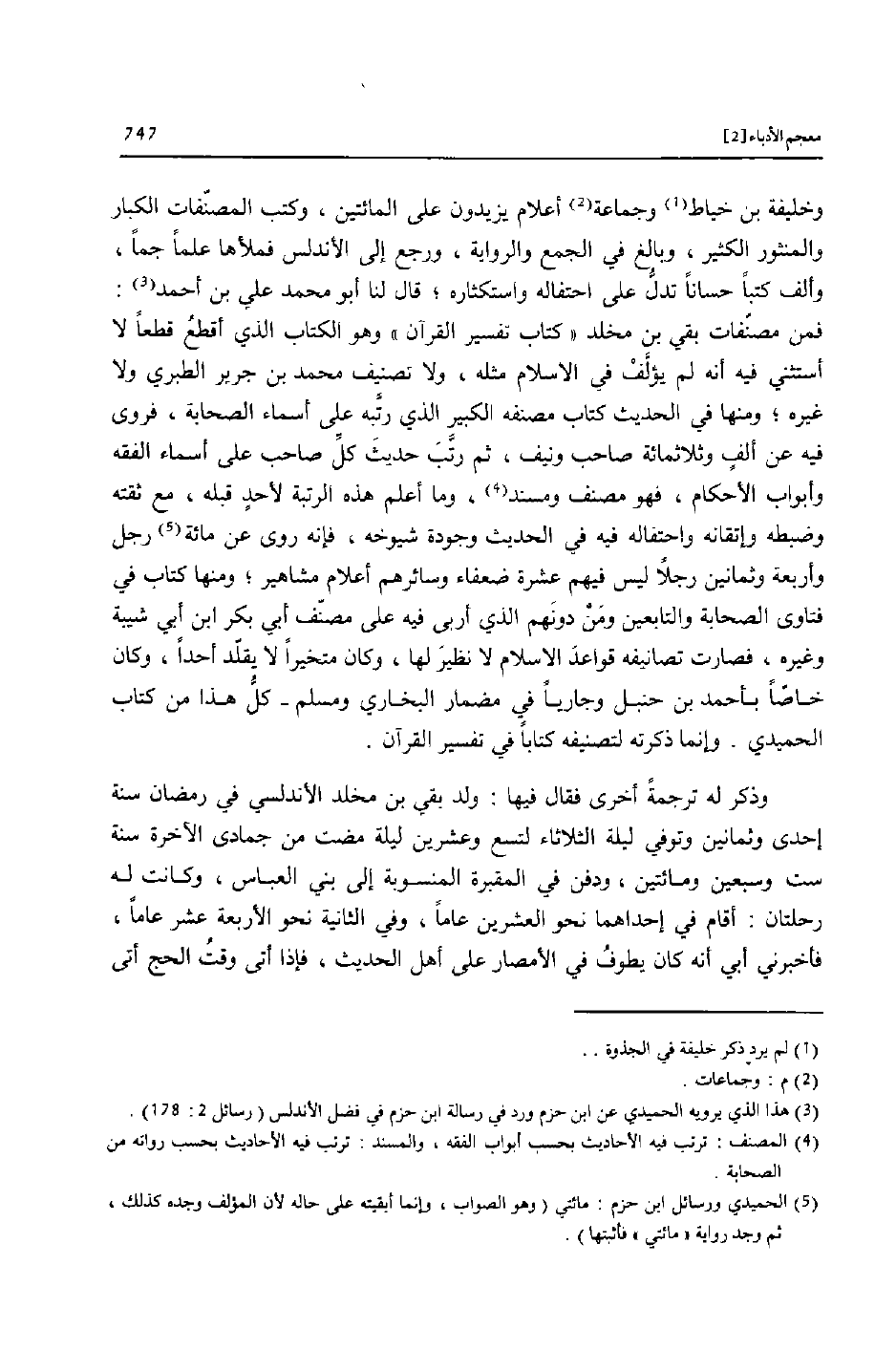 فمن مصنّفات بقي بن مخلد «كتاب تفسير القرآن» وهو الكتاب الذي أقطع قطعا لا أستثني فيه أنه لم يؤلّف في الاسلام مثله، ولا تصنيف محمد بن جرير الطبري ولا غيره؛ ومنها في الحديث كتاب مصنفه الكبير الذي رتّبه على أسماء الصحابة، فروى فيه عن ألف وثلاثمائة صاحب ونيف، ثم رتّب حديث كلّ صاحب على أسماء الفقه وأبواب الأحكام، فهو مصنف ومسند «4» ، وما أعلم هذه الرتبة لأحد قبله، مع ثقته وضبطه وإتقانه واحتفاله فيه في الحديث وجودة شيوخه، فإنه روى عن مائة «5» رجل وأربعة وثمانين رجلا ليس فيهم عشرة ضعفاء وسائرهم أعلام مشاهير؛ ومنها كتاب في فتاوى الصحابة والتابعين ومن دونهم الذي أربى فيه على مصنّف أبي بكر ابن أبي شيبة وغيره، فصارت تصانيفه قواعد الاسلام لا نظير لها، وكان متخيرا لا يقلّد أحدا، وكان خاصّا بأحمد بن حنبل وجاريا في مضمار البخاري ومسلم- كلّ هذا من كتاب الحميدي. وإنما ذكرته لتصنيفه كتابا في تفسير القرآن.
