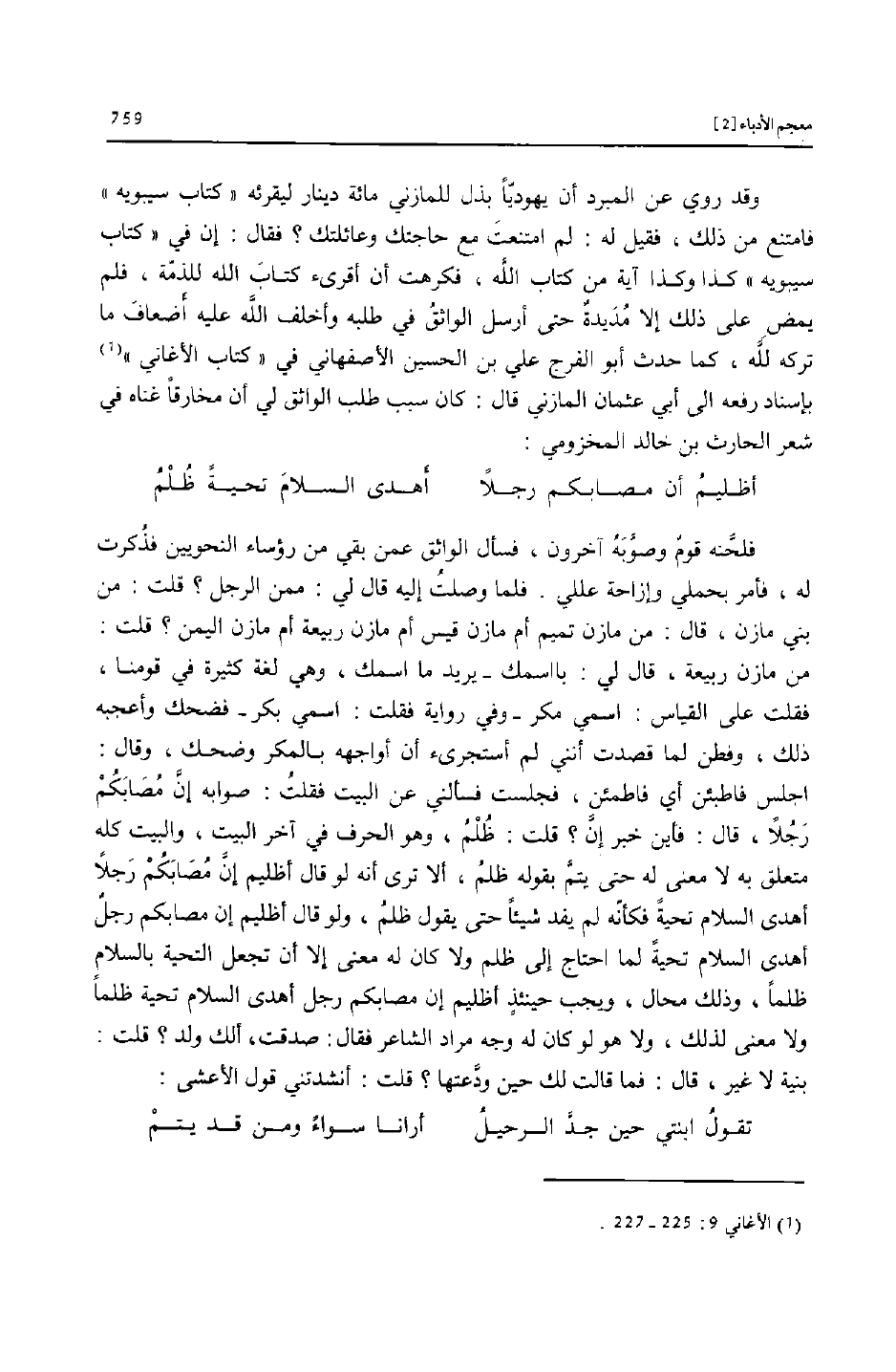 اجلس فاطبئن أي فاطمئن، فجلست فسألني عن البيت فقلت: صوابه إنّ مصابكم رجلا، قال: فأين خبر إنّ؟ قلت: ظلم، وهو الحرف في آخر البيت، والبيت كله متعلق به لا معنى له حتى يتمّ بقوله ظلم، ألا ترى أنه لو قال أظليم إنّ مصابكم رجلا أهدى السلام تحية فكأنّه لم يفد شيئا حتى يقول ظلم، ولو قال أظليم إن مصابكم رجل أهدى السلام تحية لما احتاج إلى ظلم ولا كان له معنى إلا أن تجعل التحية بالسلام ظلما، وذلك محال، ويجب حينئذ أظليم إن مصابكم رجل أهدى السلام تحية ظلما ولا معنى لذلك، ولا هو لو كان له وجه مراد الشاعر فقال: صدقت، ألك ولد؟ قلت: