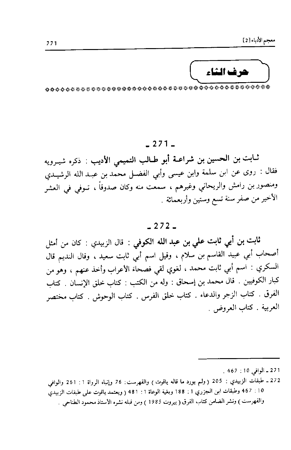 [272]- طبقات الزبيدي: 205 (ولم يورد ما قاله ياقوت) والفهرست: 76 وإنباه الرواة 1: 261 والوافي 10: 467 وطبقات ابن الجزري 1: 188 وبغية الوعاة 1: 481 (ويعتمد ياقوت على طبقات الزبيدي والفهرست) ونشر الضامن كتاب الفرق (بيروت 1985) ومن قبله نشره الأستاذ محمود الطناحي.