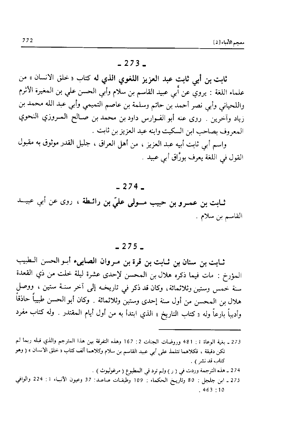 [273]- بغية الوعاة 1: 481 وروضات الجنات 2: 167 وهذه التفرقة بين هذا المترجم والذي قبله ربما لم تكن دقيقة، فكلاهما تتلمذ على أبي عبيد القاسم بن سلام وكلاهما ألف كتاب «خلق الانسان» (وهو كتاب قد نشر) .