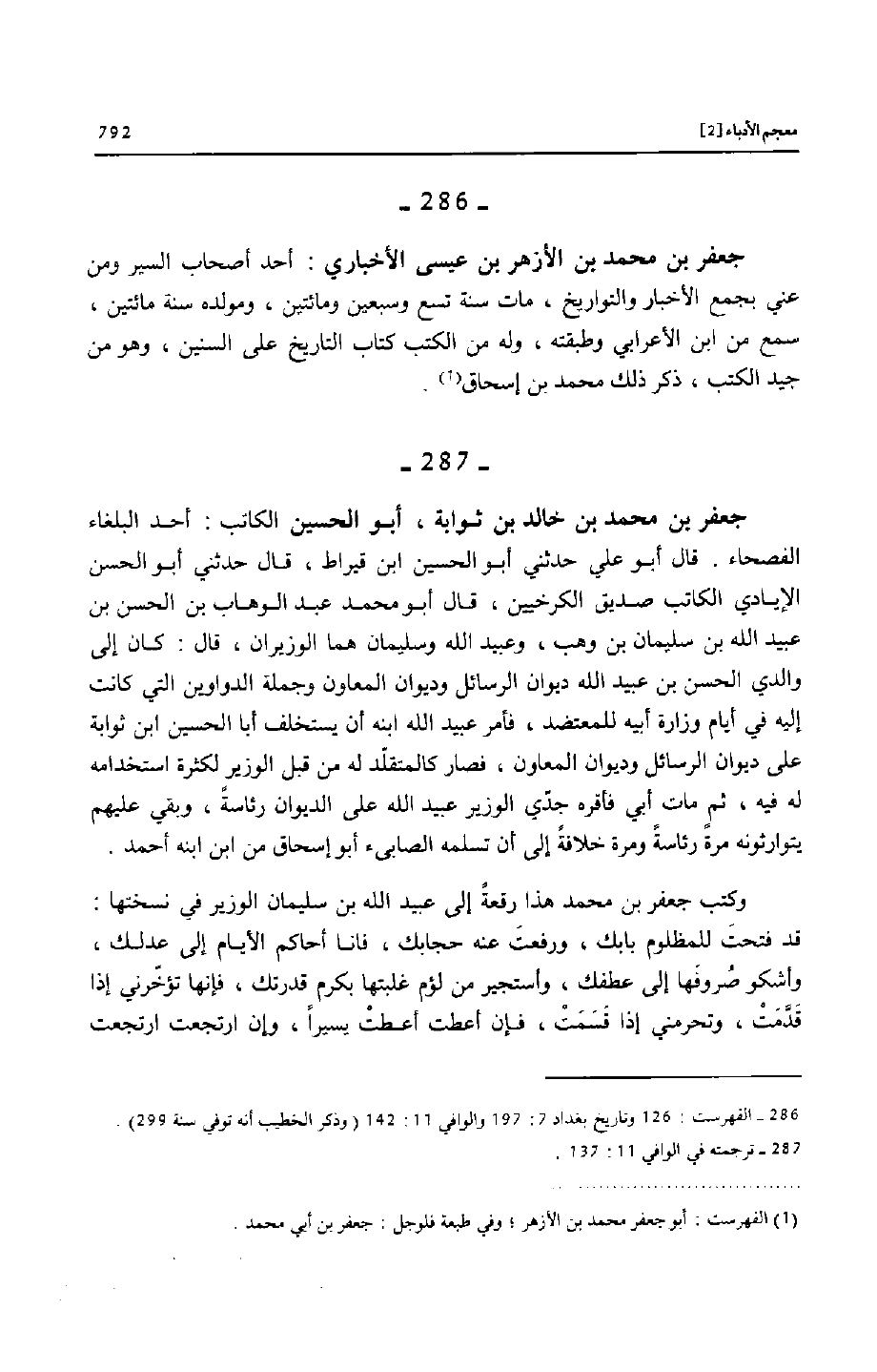 [286]- الفهرست: 126 وتاريخ بغداد 7: 197 والوافي 11: 142 (وذكر الخطيب أنه توفي سنة 299) .