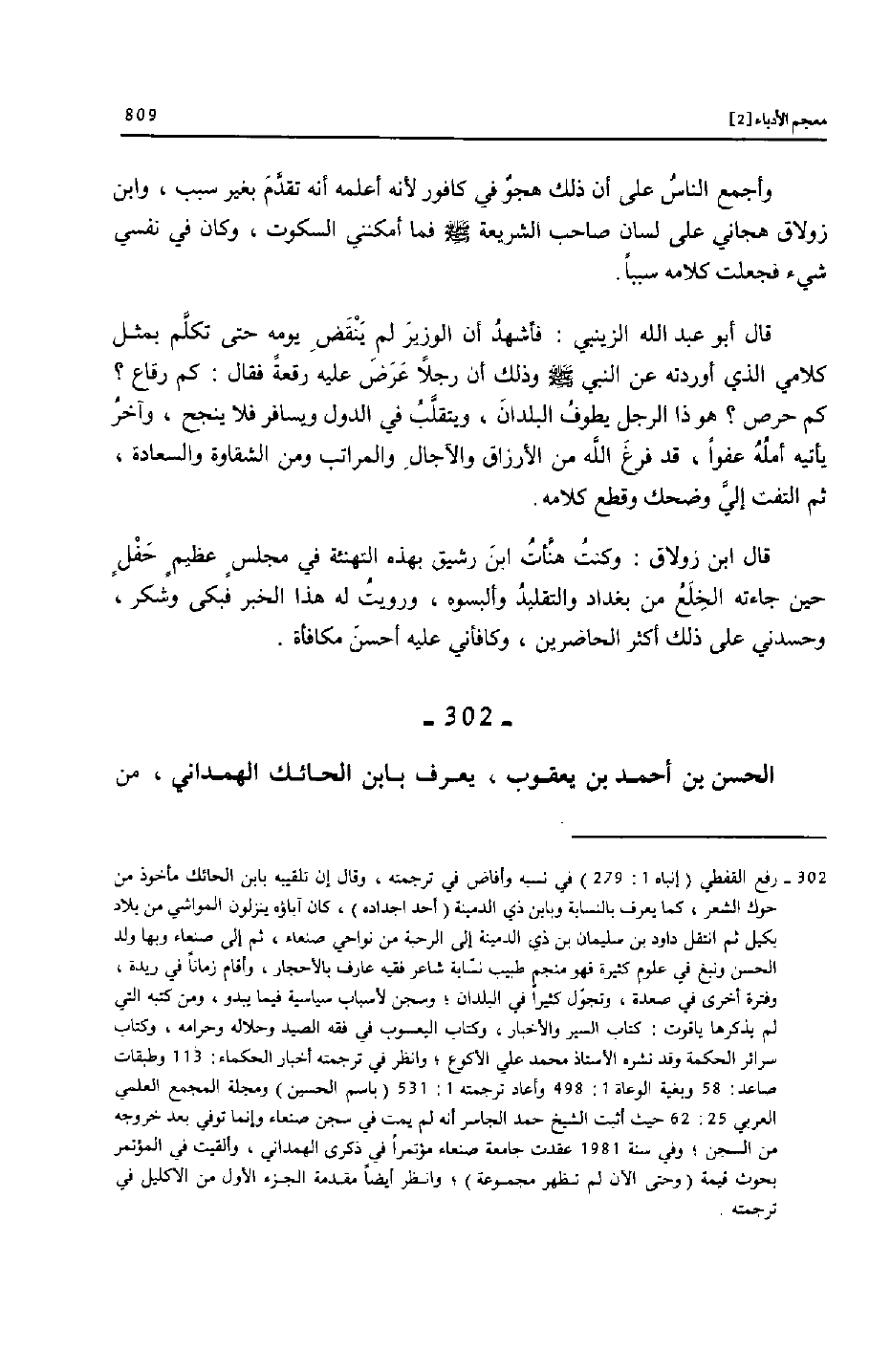 [302]- رفع القفطي (إنباه 1: 279) في نسبه وأفاض في ترجمته، وقال إن تلقيبه بابن الحائك مأخوذ من حوك الشعر، كما يعرف بالنسابة وبابن ذي الدمينة (أحد اجداده) ، كان آباؤه ينزلون المواشي من بلاد بكيل ثم انتقل داود بن سليمان بن ذي الدمينة إلى الرحبة من نواحي صنعاء، ثم إلى صنعاء وبها ولد الحسن ونبغ في علوم كثيرة فهو منجم طبيب نسّابة شاعر فقيه عارف بالأحجار، وأقام زمانا في ريدة، وفترة أخرى في صعدة، وتجوّل كثيرا في البلدان؛ وسجن لأسباب سياسية فيما يبدو، ومن كتبه التي لم يذكرها ياقوت: كتاب السير والأخبار، وكتاب اليعسوب في فقه الصيد وحلاله وحرامه، وكتاب سرائر الحكمة وقد نشره الأستاذ محمد علي الأكوع؛ وانظر في ترجمته أخبار الحكماء: 113 وطبقات صاعد: 58 وبغية الوعاة 1: 498 وأعاد ترجمته 1: 531 (باسم الحسين) ومجلة المجمع العلمي العربي 25: 62 حيث أثبت الشيخ حمد الجاسر أنه لم يمت في سجن صنعاء وإنما توفي بعد خروجه من السجن؛ وفي سنة 1981 عقدت جامعة صنعاء مؤتمرا في ذكرى الهمداني، وألقيت في المؤتمر بحوث قيمة (وحتى الآن لم تظهر مجموعة) ؛ وانظر أيضا مقدمة الجزء الأول من الأكليل في ترجمته.