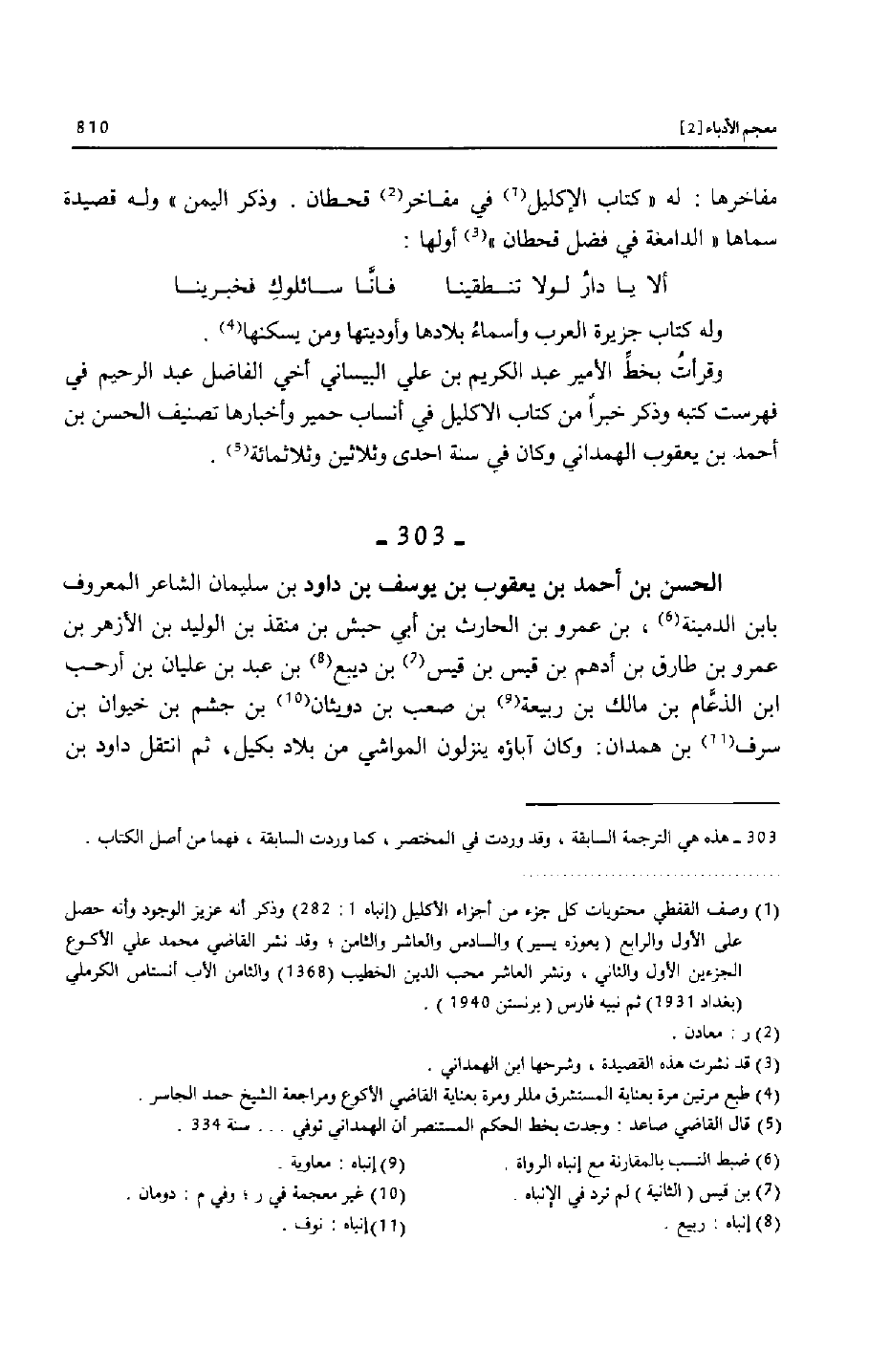 وقرأت بخطّ الأمير عبد الكريم بن علي البيساني أخي الفاضل عبد الرحيم في فهرست كتبه وذكر خبرا من كتاب الاكليل في أنساب حمير وأخبارها تصنيف الحسن بن أحمد بن يعقوب الهمداني وكان في سنة احدى وثلاثين وثلاثمائة «5» .