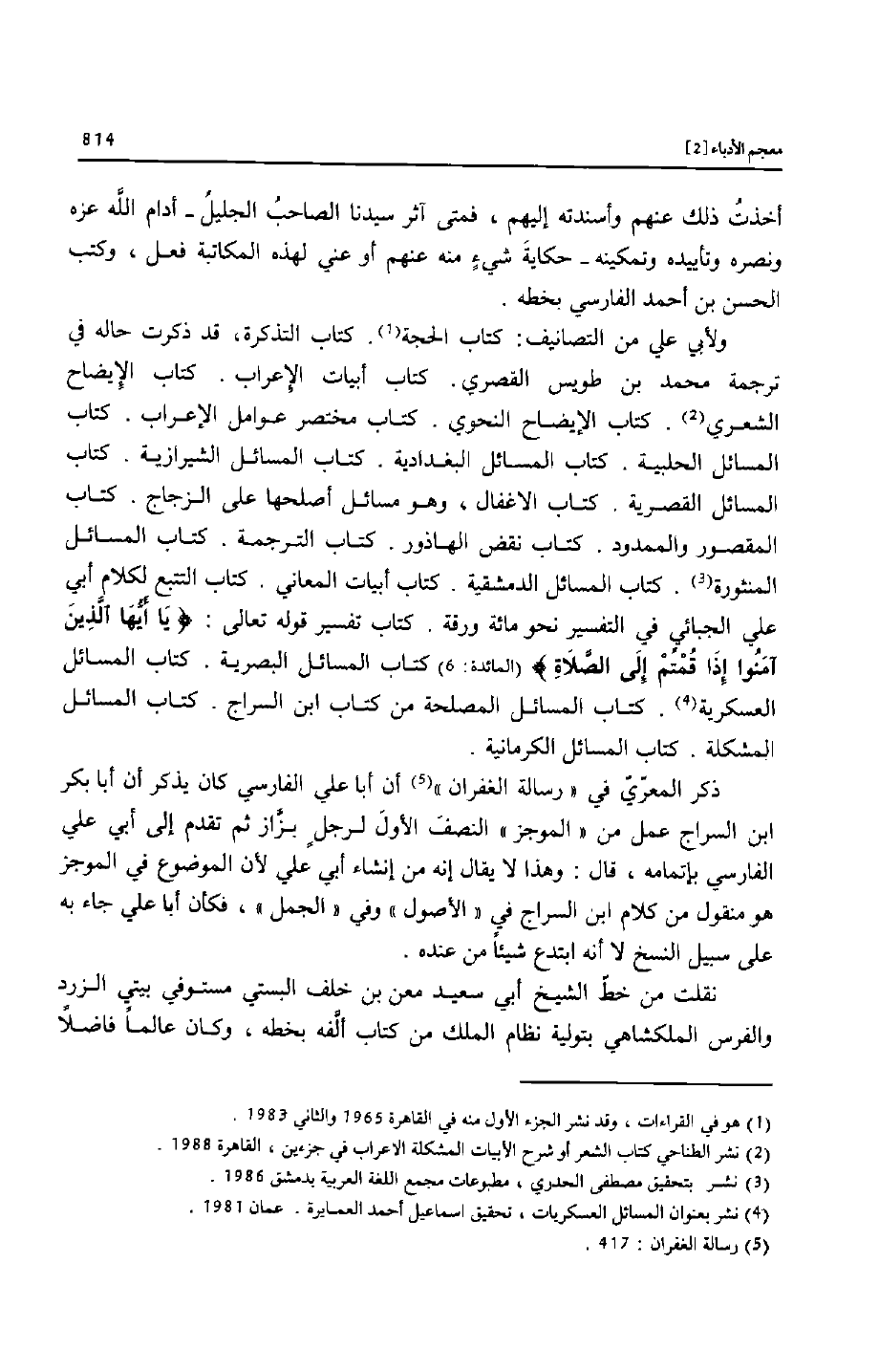 (المائدة: 6) كتاب المسائل البصرية. كتاب المسائل العسكرية «4» . كتاب المسائل المصلحة من كتاب ابن السراج. كتاب المسائل المشكلة. كتاب المسائل الكرمانية.