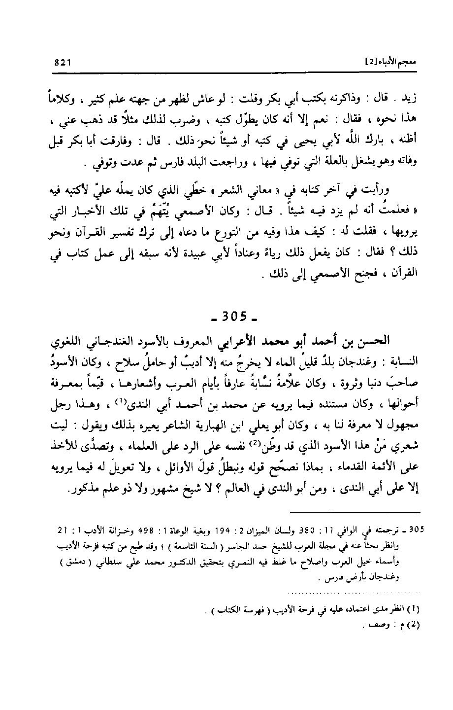 [305]- ترجمته في الوافي 11: 380 ولسان الميزان 2: 194 وبغية الوعاة 1: 498 وخزانة الأدب 1: 21 وانظر بحثا عنه في مجلة العرب للشيخ حمد الجاسر (السنة التاسعة) ؛ وقد طبع من كتبه فرحة الأديب وأسماء خيل العرب واصلاح ما غلط فيه النمري بتحقيق الدكتور محمد علي سلطاني (دمشق) وغندجان بأرض فارس.