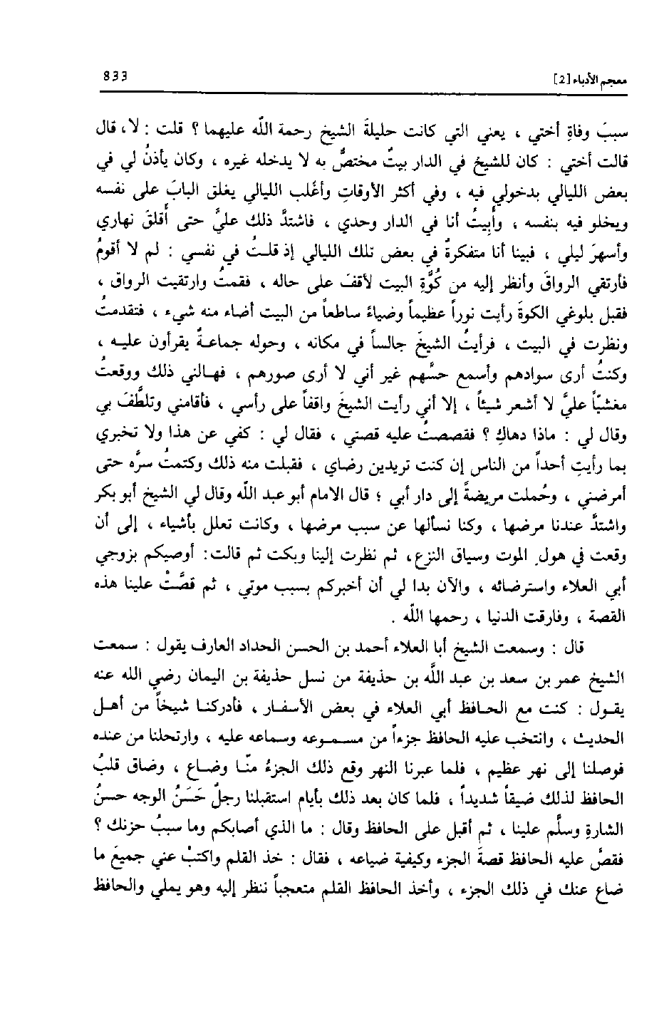 سبب وفاة أختي، يعني التي كانت حليلة الشيخ رحمة الله عليهما؟ قلت: لا، قال قالت أختي: كان للشيخ في الدار بيت مختصّ به لا يدخله غيره، وكان يأذن لي في بعض الليالي بدخولي فيه، وفي أكثر الأوقات وأغلب الليالي يغلق الباب على نفسه ويخلو فيه بنفسه، وأبيت أنا في الدار وحدي، فاشتدّ ذلك عليّ حتى أقلق نهاري وأسهر ليلي، فبينا أنا متفكرة في بعض تلك الليالي إذ قلت في نفسي: لم لا أقوم فأرتقي الرواق وأنظر إليه من كوّة البيت لأقف على حاله، فقمت وارتقيت الرواق، فقبل بلوغي الكوة رأيت نورا عظيما وضياء ساطعا من البيت أضاء منه شيء، فتقدمت ونظرت في البيت، فرأيت الشيخ جالسا في مكانه، وحوله جماعة يقرأون عليه، وكنت أرى سوادهم وأسمع حسّهم غير أني لا أرى صورهم، فهالني ذلك ووقعت مغشيّا عليّ لا أشعر شيئا، إلا أني رأيت الشيخ واقفا على رأسي، فأقامني وتلطّف بي وقال لي: ماذا دهاك؟ فقصصت عليه قصتي، فقال لي: كفي عن هذا ولا تخبري بما رأيت أحدا من الناس إن كنت تريدين رضاي، فقبلت منه ذلك وكتمت سرّه حتى أمرضني، وحملت مريضة إلى دار أبي؛ قال الامام أبو عبد الله وقال لي الشيخ أبو بكر واشتدّ عندنا مرضها، وكنا نسألها عن سبب مرضها، وكانت تعلل بأشياء، إلى أن وقعت في هول الموت وسياق النزع، ثم نظرت إلينا وبكت ثم قالت: أوصيكم بزوجي أبي العلاء واسترضائه، والآن بدا لي أن أخبركم بسبب موتي، ثم قصّت علينا هذه القصة، وفارقت الدنيا، رحمها الله.