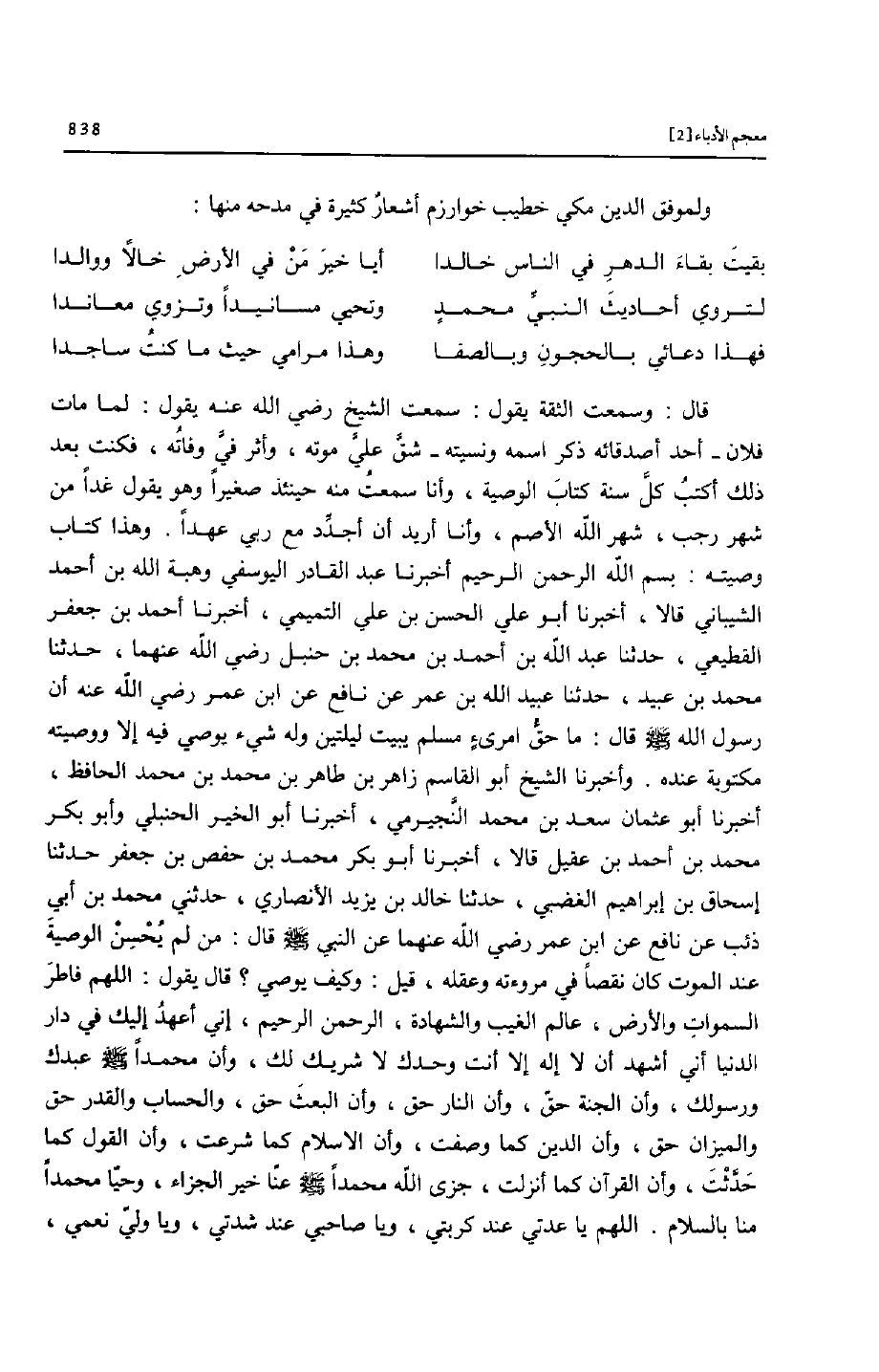 قال: وسمعت الثقة يقول: سمعت الشيخ رضي الله عنه يقول: لما مات فلان- أحد أصدقائه ذكر اسمه ونسيته- شقّ عليّ موته، وأثر فيّ وفاته، فكنت بعد ذلك أكتب كلّ سنة كتاب الوصية، وأنا سمعت منه حينئذ صغيرا وهو يقول غدا من شهر رجب، شهر الله الأصم، وأنا أريد أن أجدّد مع ربي عهدا. وهذا كتاب وصيته: بسم الله الرحمن الرحيم أخبرنا عبد القادر اليوسفي وهبة الله بن أحمد الشيباني قالا، أخبرنا أبو علي الحسن بن علي التميمي، أخبرنا أحمد بن جعفر القطيعي، حدثنا عبد الله بن أحمد بن محمد بن حنبل رضي الله عنهما، حدثنا محمد بن عبيد، حدثنا عبيد الله بن عمر عن نافع عن ابن عمر رضي الله عنه أن رسول الله صلى الله عليه وسلّم قال: ما حقّ امرىء مسلم يبيت ليلتين وله شيء يوصي فيه إلا ووصيته مكتوبة عنده. وأخبرنا الشيخ أبو القاسم زاهر بن طاهر بن محمد بن محمد الحافظ، أخبرنا أبو عثمان سعد بن محمد النّجيرمي، أخبرنا أبو الخير الحنبلي وأبو بكر محمد بن أحمد بن عقيل قالا، أخبرنا أبو بكر محمد بن حفص بن جعفر حدثنا إسحاق بن إبراهيم الغضبي، حدثنا خالد بن يزيد الأنصاري، حدثني محمد بن أبي ذئب عن نافع عن ابن عمر رضي الله عنهما عن النبي صلى الله عليه وسلّم قال: من لم يحسن الوصية عند الموت كان نقصا في مروءته وعقله، قيل: وكيف يوصي؟ قال يقول: اللهم فاطر السموات والأرض، عالم الغيب والشهادة، الرحمن الرحيم، إني أعهد إليك في دار الدنيا أني أشهد أن لا إله إلا أنت وحدك لا شريك لك، وأن محمدا صلى الله عليه وسلّم عبدك ورسولك، وأن الجنة حقّ، وأن النار حق، وأن البعث حق، والحساب والقدر حق والميزان حق، وأن الدين كما وصفت، وأن الاسلام كما شرعت، وأن القول كما حدّثت، وأن القرآن كما أنزلت، جزى الله محمدا صلى الله عليه وسلّم عنّا خير الجزاء، وحيّا محمدا منا بالسلام. اللهم يا عدتي عند كربتي، ويا صاحبي عند شدتي، ويا وليّ نعمي،