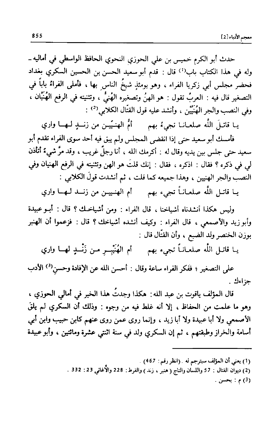 حدث أبو الكرم خميس بن علي الحوزي النحوي الحافظ الواسطي في أماليه- وله في هذا الكتاب باب «1» قال: قدم أبو سعيد الحسن بن الحسين السكري بغداد فحضر مجلس أبي زكريا الفراء، وهو يومئذ شيخ الناس بها، فأملى الفراء بابا في التصغير قال فيه: العرب تقول: هو الهن وتصغيره الهنيّ، وتثنيته في الرفع الهنيّان، وفي النصب والجر الهنيّين، وأنشد عليه قول القتّال الكلابي «2» :