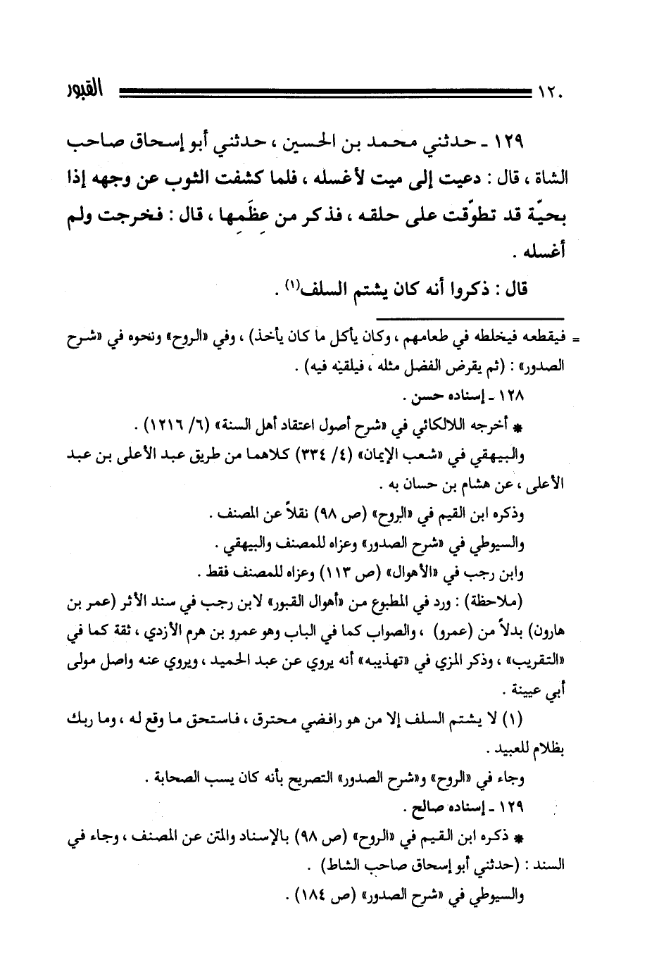 129- حدثني محمد بن الحسين حدثني أبو إسحاق صاحب الشاة قال دعيت إلى ميت لأغسله فلما كشفت الثوب عن وجهه إذا بحية قد تطوقت على حلقه فذكر من عظمها قال فخرجت ولم أغلسه قال ذكروا أنه كان يشتم السلف.