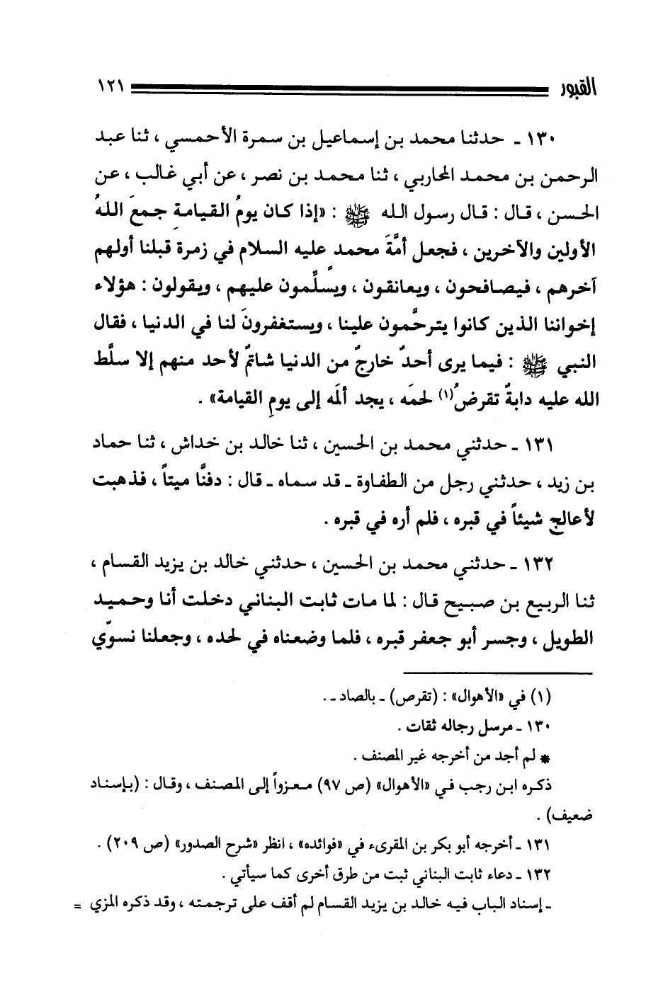 130- حدثنا محمد بن إسماعيل بن سمرة الأحمسي ثنا عبد الرحمن بن محمد المحاربي ثنا محمد بن نصر عن أبي غالب عن الحسن قال قال رسول الله صلى الله عليه وسلم إذا كان يوم القيامة جمع الله الأولين والآخرين فجعل أمة محمد عليه السلام في زمرة قبلنا أولهم آخرهم فيصافحون ويعانقون ويسلمون عليهم ويقولون هؤلاء إخواننا الذين كانوا يترحمون علينا ويستغفرون لنا في الدنيا فقال النبي صلى الله عليه وسلم فيما يرى أحد خارج من الدنيا شاتم لأحد منهم إلا سلط الله عليه دابة تقرض لحمه يجد ألمه إلى يوم القيامة.