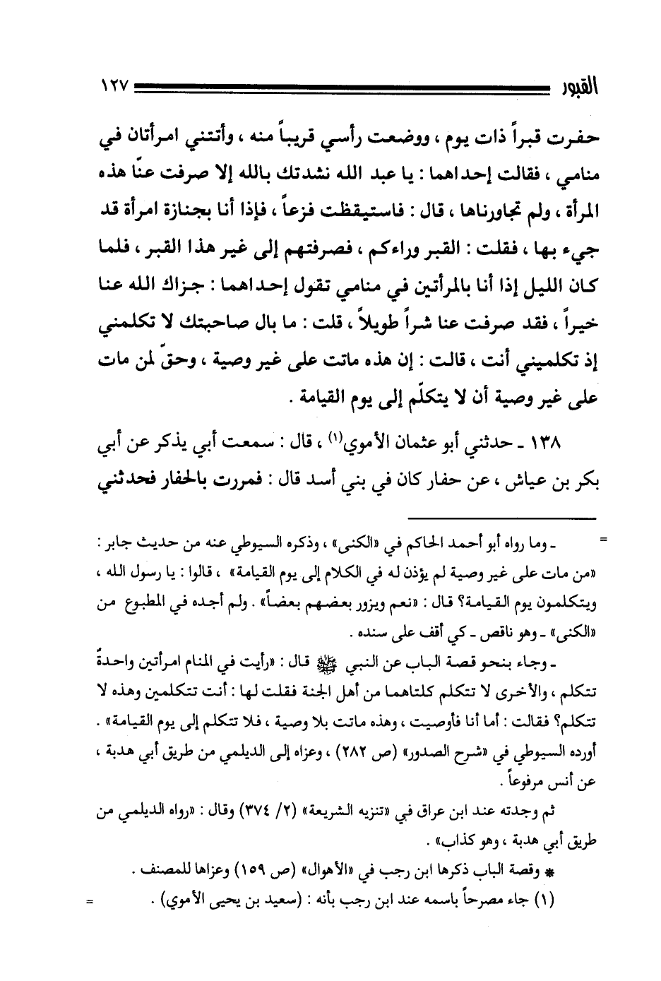 138- حدثني أبو عثمان الأموي قال سمعت أبي يذكر عن أبي بكر بن عياش عن حفار كان في بني أسد قال فمررت بالحفار فحدثني -[128]- كما حدثني أبو بكر عنه قال كنت أنا وشريك لي نتحارس مقبرة بني أسد فإني بليلة في المقابر إذ سمعت قائلا يقول من قبر يا عبد الله قال مالك يا جابر قال تأتينا أمنا قال وما ينفعنا الأفضل أبينا إن أبي قد غضب عليها وحلف أن لا يصلي عليها قال فجعلا يكرران مرارا فجئت لشريكي فجعل يسمع الصوت ولا يفهم الكلام فلقنته إياه ثم تفهم ففهمه فلما كان من غد جاءني رجل فقال لي احفر لي هاهنا قبرا بين القبرين اللذين سمعت فيهما الكلام فقلت أو اسم هذا جابر واسم هذا عبد الله قال نعم فأخبرته بما سمعت فقال نعم قد كنت حلفت أن لا أصلي عليها لا جرم لأكفرن عن يميني ولأصلين عليها ولأترحمن عليها قال ثم مر بي بعد ذلك وبيده عكازه ومعه إداوة فقال إني أريد الحج لمكان يميني تلك.