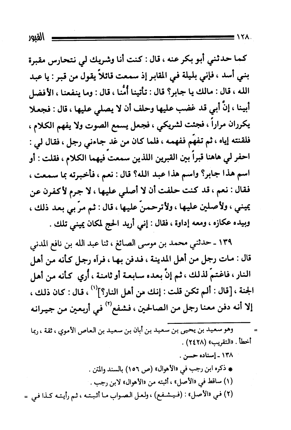 139- حدثني محمد بن موسى الصائغ ثنا عبد الله بن نافع المدني قال مات رجل من أهل المدينة فدفن بها فرآه رجل كأنه من أهل النار فاغتم لذلك ثم إن بعده سابعة أو ثامنة أري كأنه من أهل الجنة قال ألم تكن قلت إنك من أهل النار قال كان ذلك إلا أنه دفن معنا رجل من الصالحين فشفع في أربعين من جيرانه -[129]- وكنت فيهم.