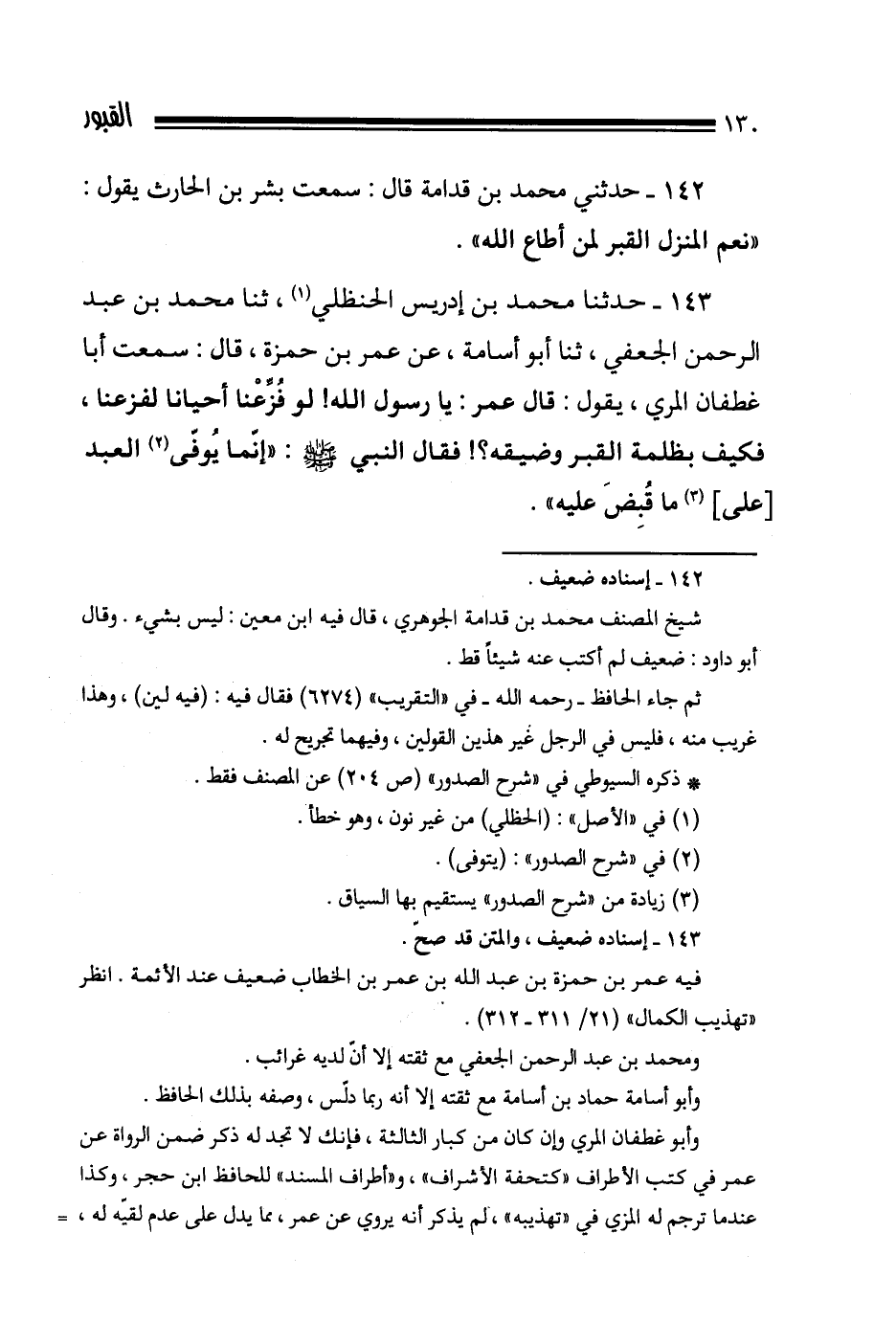142- حدثني محمد بن قدامة قال سمعت بشر بن الحارث يقول نعم المنزل القبر لمن أطاع الله.