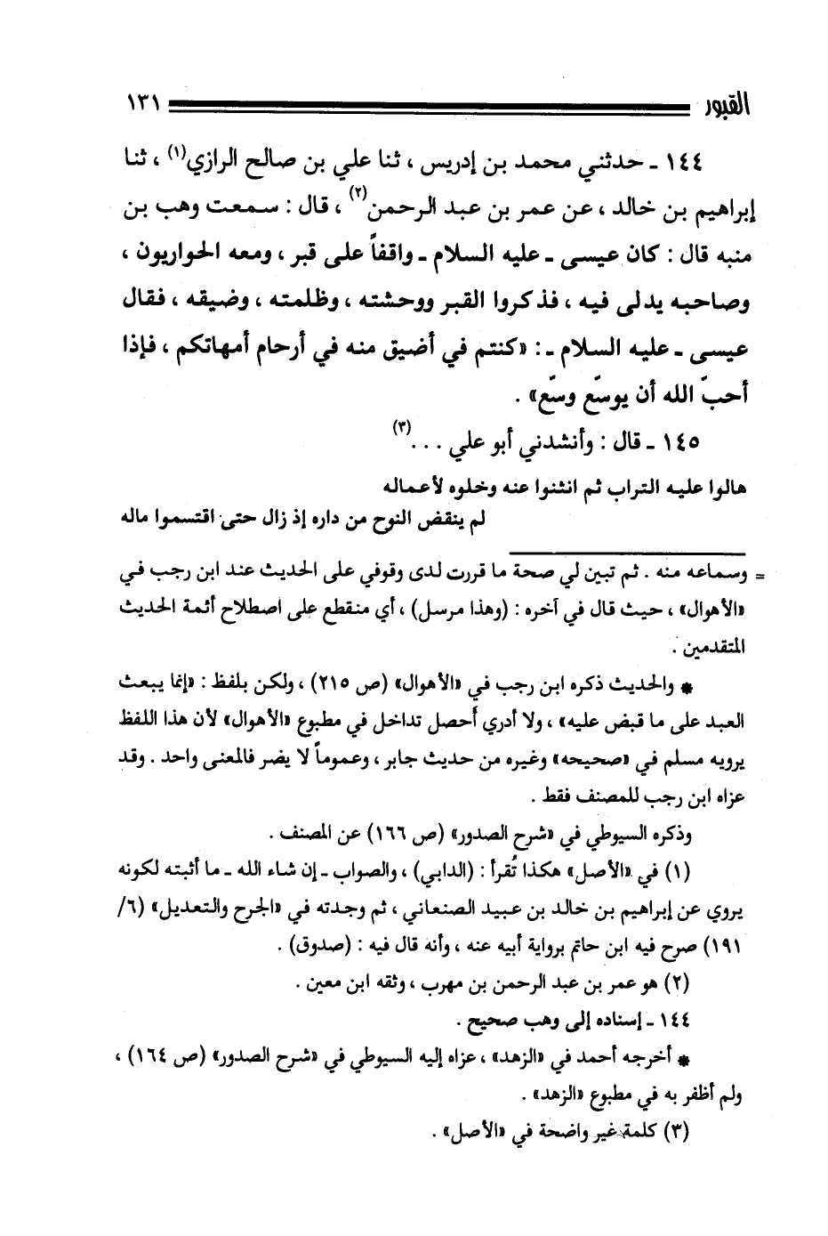 144- حدثني محمد بن إدريس ثنا علي بن صالح الرازي ثنا إبراهيم بن خالد عن عمر بن عبد الرحمن قال سمعت وهب بن منبه قال كان عيسى عليه السلام واقفا على قبر ومعه الحواريون وصاحبه يدلى فيه فذكروا القبر ووحشته وظلمته وضيقه فقال عيسى عليه السلام كنتم في أضيق منه في أرحام أمهاتكم فإذا أحب الله أن يوسع وسع.