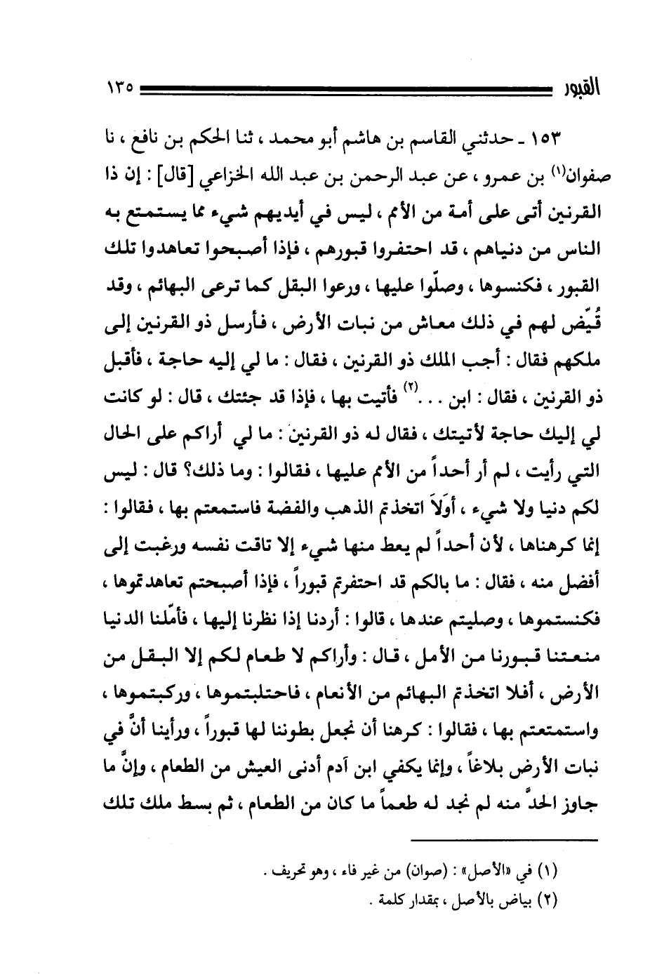 153- حدثني القاسم بن هاشم أبو محمد ثنا الحكم بن نافع نا صفوان بن عمرو عن عبد الرحمن بن عبد الله الخزاعي قال إن ذا القرنين أتى على أمة من الأمم ليس في أيديهم شيء مما يستمتع به الناس من دنياهم قد احتفروا قبورهم فإذا أصبحوا تعاهدوا تلك القبور فكنسوها وصلوا عليها ورعوا البقل كما ترعى البهائم وقد قيض لهم في ذلك معاش من نبات الأرض فأرسل ذو القرنين إلى ملكهم فقال أجب الملك ذو القرنين فقال ما لي إليه حاجة فأقبل ذو القرنين فقال ابن.. . فأتيت بها فإذا قد جئتك قال لو كانت لي إليك حاجة لأتيتك فقال له ذو القرنين ما لي أراكم على الحال التي رأيت لم أر أحدا من الأمم عليها فقالوا وما ذلك قال ليس لكم دنيا ولا شيء أولا اتخذتم الذهب والفضة فاستمعتم بها فقالوا إنما كرهناها لأن أحدا لم يعط منها شيء إلا تاقت نفسه ورغبت إلى أفضل منه فقال ما بالكم قد احتفرتم قبورا فإذا أصبحتم تعاهدتموها فكنستموها وصليتم عندها قالوا أردنا إذا نظرنا إليها فأملنا الدنيا منعتنا قبورنا من الأمل قال وأراكم لا طعام لكم إلا البقل من الأرض أفلا اتخذتم البهائم من الأنعام فاحتلبتموها وركبتموها واستمتعتم بها فقالوا كرهنا أن نجعل بطوننا لها قبورا ورأينا أن في نبات الأرض بلاغا وإنما يكفي ابن آدم أدنى العيش من الطعام وإن ما جاوز الحد منه لم نجد له طعما ما كان من الطعام ثم بسط ملك تلك -[136]- الأمة يده خلف ذي القرنين فتناول جمجمة فقال يا ذا القرنين أتدري من هذا قال لا ومن هو قال هذا ملك من ملوك الأرض أعطاه الله سلطانا على أهل الأرض فغشم وظلم وعتى فلما رأى الله ذلك منه حسمه بالموت فصار كالحجر الملقى حتى أحصى الله عليه عمله حتى يجزيه في آخرته ثم ناوله جمجمة أخرى فقال يا ذا القرنين تدري من هذا قال لا ومن هو قال هذا ملك ملكه الله بعده وكان يرى ما يصنع الذي قبله بالناس من الغشم والظلم والفجر فتواضع لله وخشع لله وعمل بالعدل في أهل مملكته فصار كما ترى قد أحصى الله عليه عمله حتى يجزيه في آخرته ثم أهوى إلى جمجمة ذي القرنين فقال وهذه الجمجمة قد كانت كهاتين فانظر يا ذا القرنين ما أنت صانع فقال له ذو القرنين هل لك في صحبتي فأتخذك أخا أو وزيرا أو شريكا فيما يأتي الله من هذا المال قال ما أصلح أنا وأنت في مكان ولا أن نكون جميعا قال له ذو القرنين ولما قال من أجل أن الناس كلهم لك عدو ولي صديق قال وعم ذلك قال يعادونك لما في يديك من الملك والمال ولا أجد أحداً يعاديني لرفضي ذلك ولما عندي من الحاجة وقلة الشيء فانصرف عنه ذو القرنين.