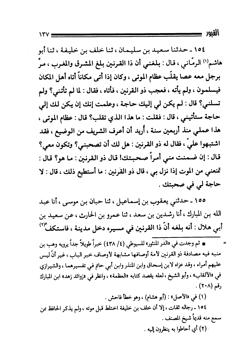 154- حدثنا سعيد بن سلميان ثنا خلف بن خليفة ثنا أبو هاشم الرماني قال بلغني أن ذا القرنين بلغ المشرق والمغرب مر برجل معه عصا يقلب عظام الموتى وكان إذا أتى مكانا أتاه أهل المكان فيسلمون ولم يأته فعجب ذو القرنين فأتاه فقال لما لم تأتني ولم تسلني قال لم يكن لي إليك حاجة وعلمت إنك إن يكن لك إلي حاجة ستأتيني قال فقلت ما هذا الذي تقلب قال عظام الموتى هذا عملي منذ أربعين سنة أريد أن أعرف الشريف من الوضيع فقد اشتبهوا علي فقال له ذو القرنين هل لك أن تصحبني وتكون معي قال إن ضمنت مني أمرا صحبتك قال ذو القرنين ما هو قال تمنعني من الموت إذا نزل بي قال ذو القرنين ما أستطيع ذلك قال لا حاجة لي في صحبتك.