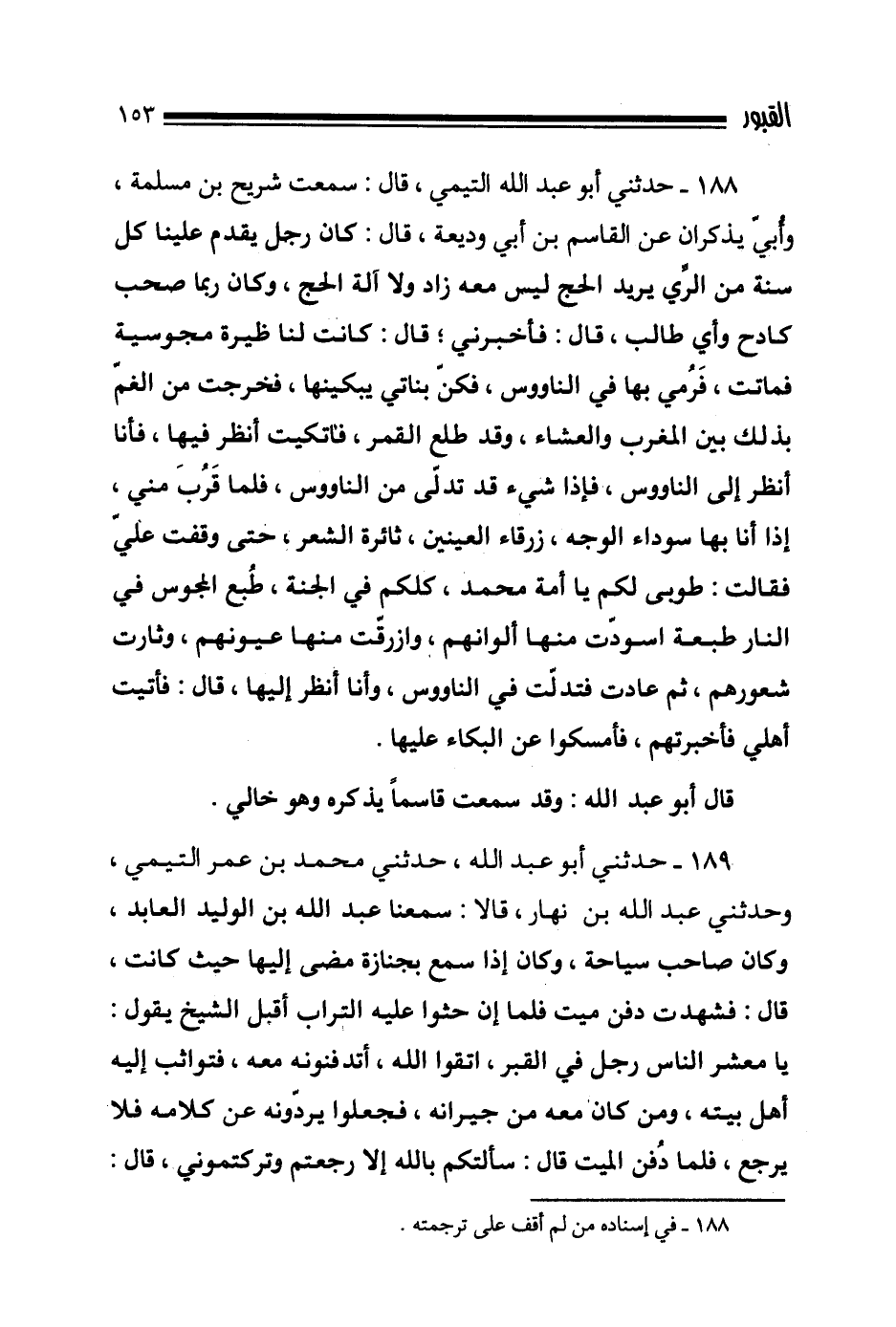 188- حدثني أبو عبد الله التيمي قال سمعت شريح بن مسلمة وأبي يذكران عن القاسم بن أبي وديعة قال كان رجل يقدم علينا كل سنة من الري يريد الحج ليس معه زاد ولا آلة الحج وكان ربما صحب كادح وأي طالب قال فأخبرني قال كانت لنا ظيرة مجوسية فماتت فرمي بها في الناووس فكن بناتي يبكينها فخرجت من الغم بذلك بين المغرب والعشاء وقد طلع القمر فاتكيت أنظر فيها فأنا أنظر إلى الناووس فإذا شيء قد تدلى من الناووس فلما قرب مني إذا أنا بها سوداء الوجه زرقاء العينين ثائرة الشعر حتى وقفت علي فقالت طوبى لكم يا أمة محمد كلكم في الجنة طبع المجوس في النار طبعة اسودت منها ألوانهم وازرقت منها عيونهم وثارت شعورهم ثم عادت فتدلت في الناووس وأنا أنظر إليها قال فأتيت أهلي فأخبرتهم فأمسكوا عن البكاء عليها قال أبو عبد الله وقد سمعت قاسما يذكره وهو خالي.