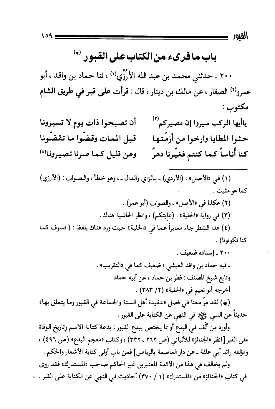 200- حدثني محمد بن عبد الله الأرزي ثنا حماد بن واقد أبو عمرو الصفار عن مالك بن دينار قال قرأت على قبر في طريق الشام مكتوب