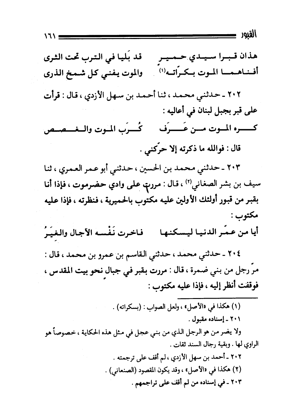 204- حدثني محمد حدثني القاسم بن عمرو بن محمد قال مر رجل من بني ضمرة قال مررت بقبر في جبال نحو بيت المقدس فوقفت أنظر إليه فإذا عليه مكتوب