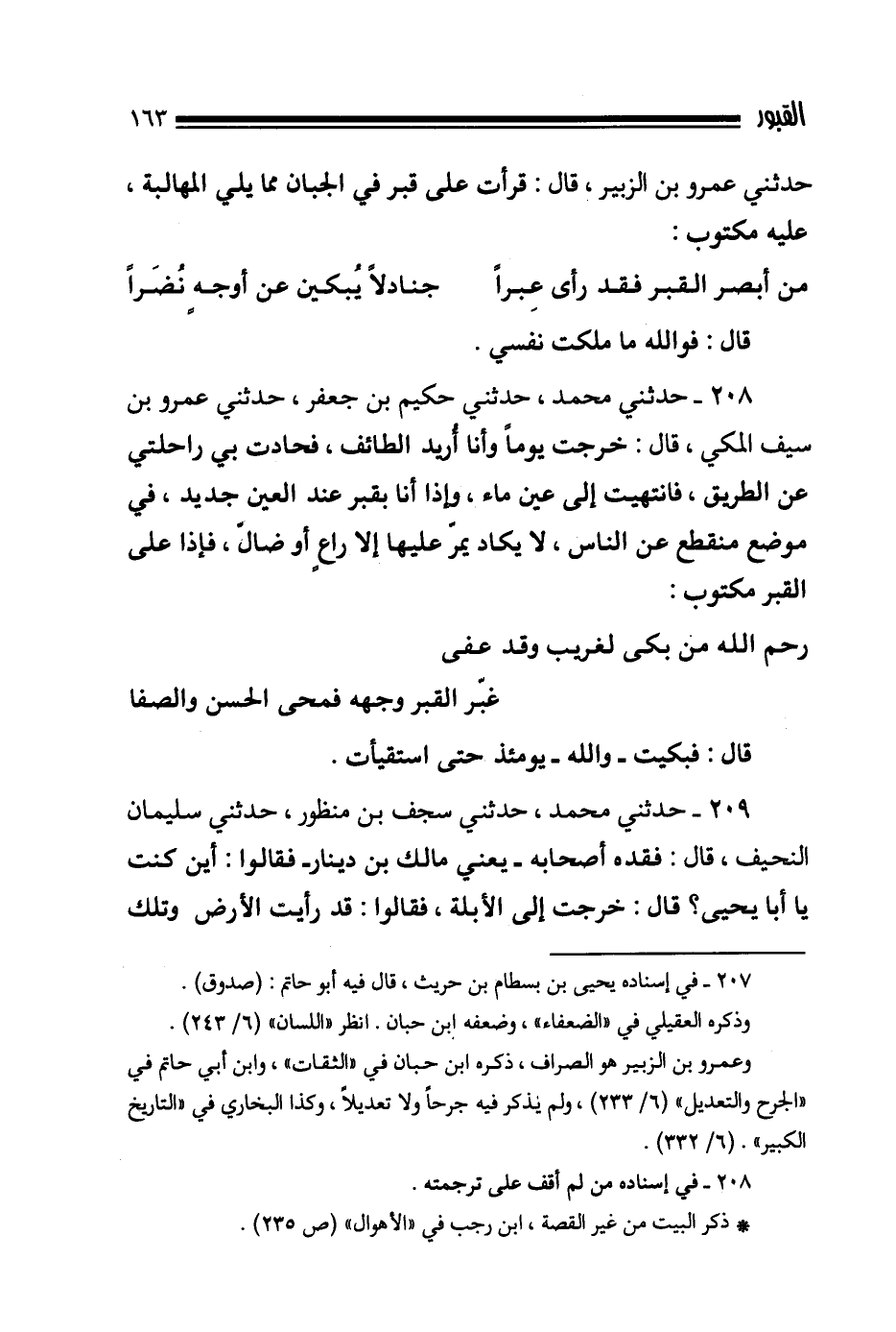 208- حدثني محمد حدثني حكيم بن جعفر حدثني عمرو بن سيف المكي قال خرجت يوما وأنا أريد الطائف فحادت بي راحلتي عن الطريق فانتهيت إلى عين ماء وإذا أنا بقبر عند العين جديد في موضع منقطع عن الناس لا يكاد يمر عليها إلا راع أو ضال فإذا على القبر مكتوب