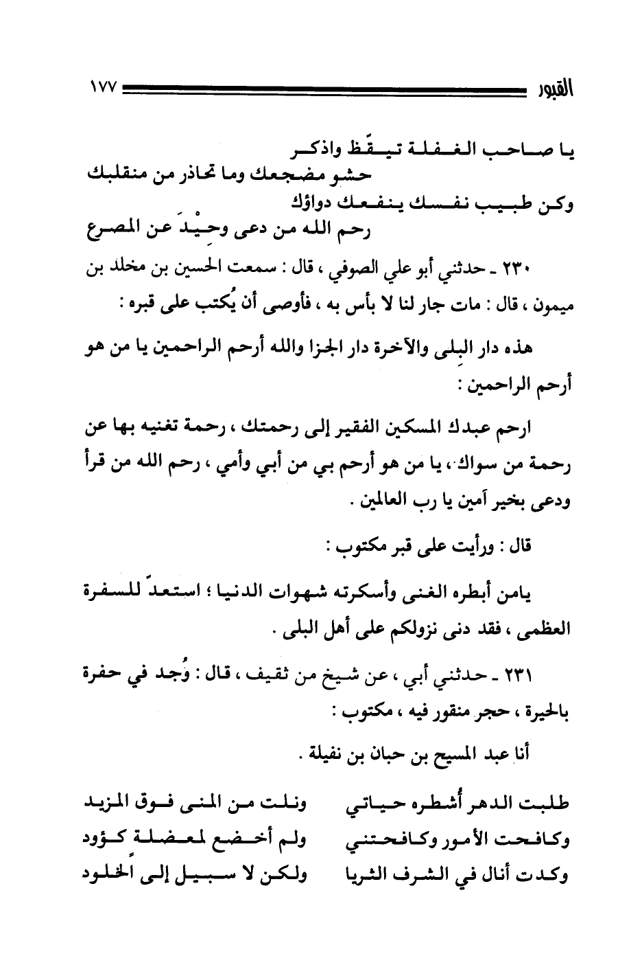 230- حدثني أبو علي الصوفي قال سمعت الحسين بن مخلد بن ميمون قال مات جار لنا لا بأس به فأوصى أن يكتب على قبره هذه دار البلى والآخرة دار الجزا والله أرحم الراحمين يا من هو أرحم الراحمين ارحم عبدك المسكين الفقير إلى رحمتك رحمة تغنيه بها عن رحمة من سواك يا من هو أرحم بي من أبي وأمي رحم الله من قرأ ودعى بخير آمين يا رب العالمين قال ورأيت على قبر مكتوب يا من أبطره الغنى وأسكرته شهوات الدنيا استعد للسفرة العظمى فقد دنى نزولكم على أهل البلى.