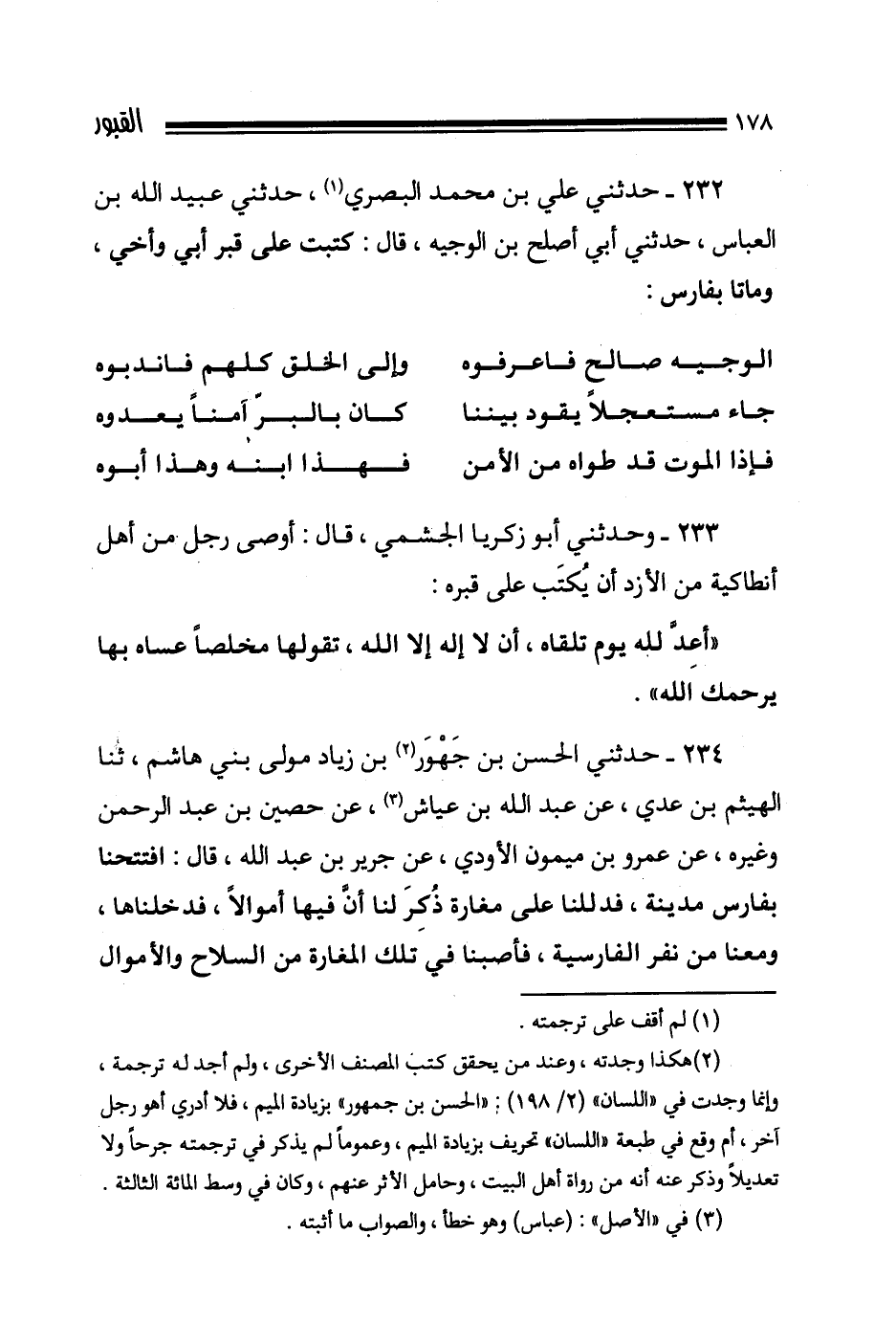 232- حدثني علي بن محمد البصري حدثني عبيد الله بن العباس حدثني أبي أصلح بن الوجيه قال كتبت على قبر أبي وأخي وماتا بفارس