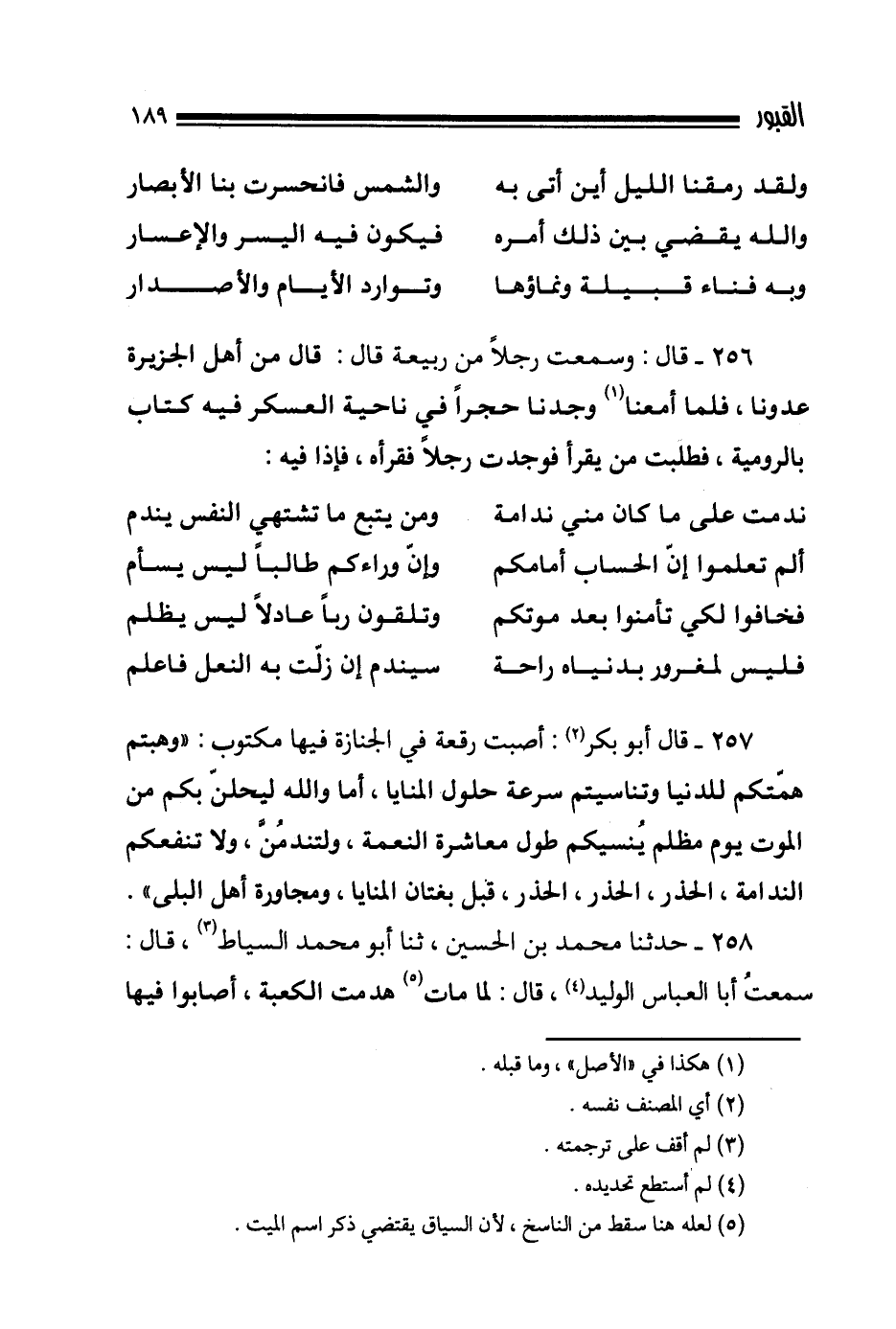 257- قال أبو بكر أصبت رقعة في الجنازة فيها مكتوب وهبتم همتكم للدنيا وتناسيتم سرعة حلول المنايا أما والله ليحلن بكم من الموت يوم مظلم ينسيكم طول معاشرة النعمة ولتندمن ولا تنفعكم الندامة الحذر الحذر الحذر قبل بغتان المنايا ومجاورة أهل البلى.