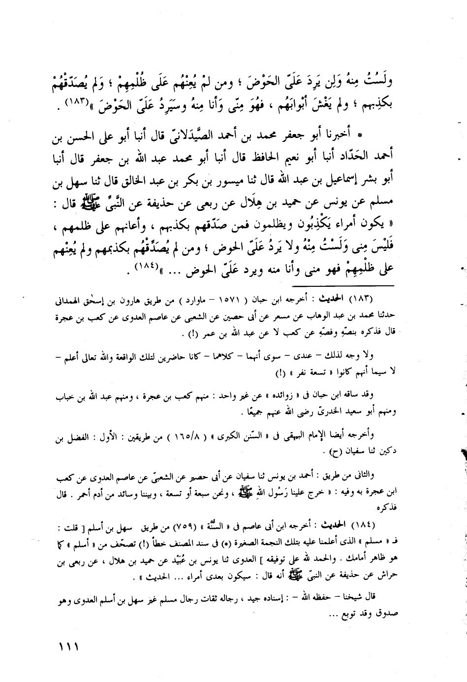 أخبرنا أبو جعفر محمد بن أحمد الصيدلاني، قال: أنبا أبو علي الحسن بن أحمد الحداد، أنبا أبو نعيم الحافظ، قال: أنبا أبو محمد عبد الله بن جعفر، قال: أنبا أبو بشر إسماعيل بن عبد الله، قال: ثنا ميسور بن بكر بن عبد الخالق، قال: ثنا سهل بن مسلم، عن يونس، عن حميد بن هلال، عن ربعي، عن حذيفة، عن النبي صلى الله عليه وسلم قال: «يكون أمراء يكذبون ويظلمون فمن صدقهم بكذبهم، وأعانهم على ظلمهم، فليس مني ولست منه ولا يرد على الحوض؛ ومن لم يصدقهم بكذبهم ولم يعنهم على ظلمهم، فهو مني وأنا منه ويرد علي الحوض» .