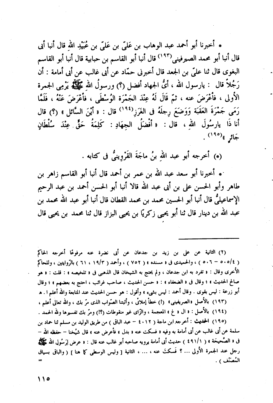 أخبرنا أبو أحمد عبد الوهاب بن علي بن علي بن عبيد الله، قال: أنبا أبي، قال: أنبا أبو محمد الصيرفيني، قال: أنبا أبو القاسم بن حبابة، قال: أنبا أبو القاسم البغوي، قال: ثنا علي بن الجعد، قال أخبرني حماد، عن أبي غالب، عن أبي أمامة: أن رجلا قال: يا رسول الله، أي الجهاد أفضل؟ ورسول الله صلى الله عليه وسلم يرمي الجمرة الأولى، فأعرض عنه، ثم قال له عند الجمرة الوسطى، فأعرض عنه، فلما رمى جمرة العقبة ووضع رجله في الغرز قال: «أين السائل» ؟ قال: أنا ذا يا رسول الله، قال: " أفضل الجهاد: كلمة حق عند سلطان جائر ".