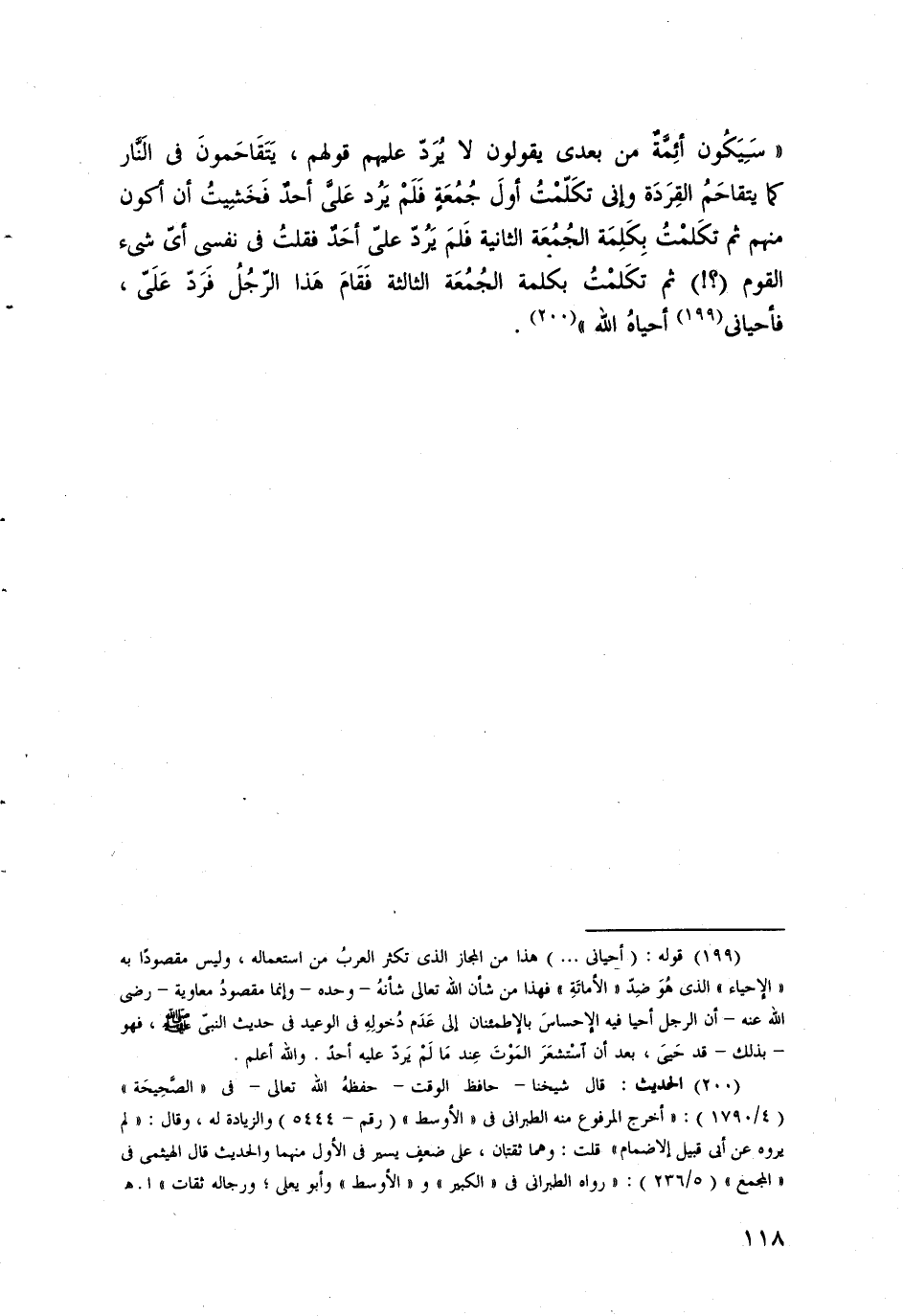 " وسيكون أئمة من بعدي يقولون لا يرد عليهم قولهم، يتقاحمون في النار كما يتقاحم القردة وإني تكلمت أول جمعة فلم يرد علي أحد؛ فخشيت أن أكون منهم ثم تكلمت بكلمة الجمعة الثانية فلم يرد علي أحد، فقلت في نفسي أي شيء القوم؟! ثم تكلمت بكلمة الجمعة الثالثة فقام هذا الرجل فرد علي، فأحياني أحياه الله.