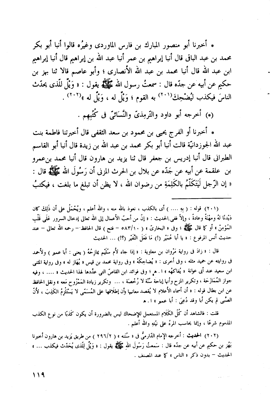 أخبرنا أبو منصور المبارك بن فارس الماوردي وغيره، قالوا: أنبا أبو بكر محمد بن عبد الباقي، قال: أنبا إبراهيم بن عمر، أنبا عبد الله بن إبراهيم، قال: أنبا إبراهيم بن عبد الله، قال: أنبا محمد بن عبد الله الأنصاري؛ وأبو عاصم، قالا: ثنا بهز بن حكيم، عن أبيه، عن جده، قال: سمعت رسول الله صلى الله عليه وسلم يقول: «ويل للذي يحدث الناس فيكذب ليضحك به القوم؛ ويل له، ويل له» .