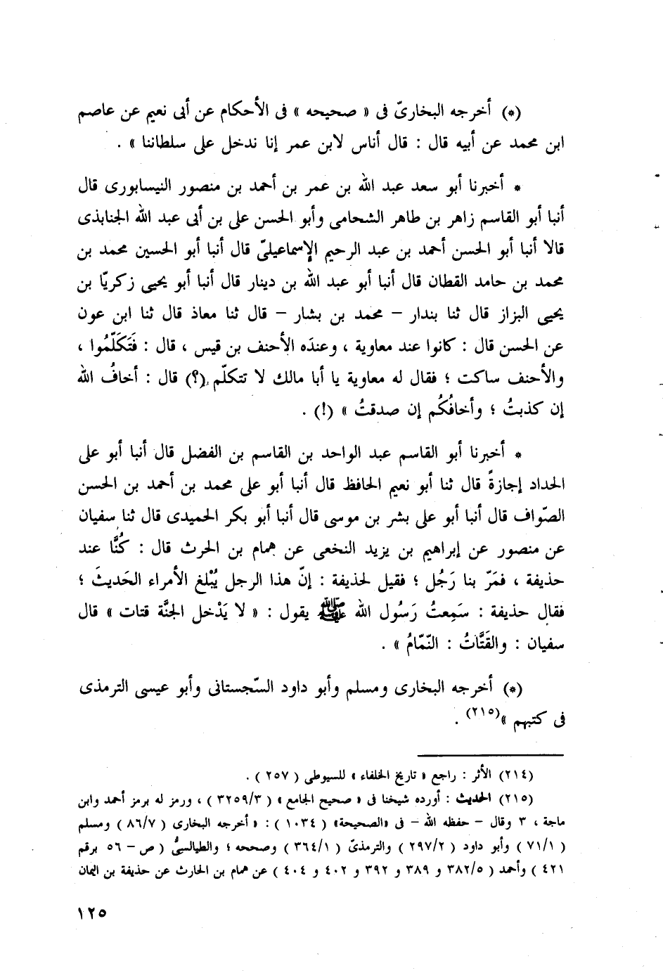 أخبرنا أبو القاسم عبد الواحد بن القاسم بن الفضل، قال: أنبا أبو علي الحداد إجازة، قال: ثنا أبو نعيم الحافظ، قال: أنبا أبو علي محمد بن أحمد بن الحسن الصواف، قال: أنبا أبو علي بشر بن موسى، قال: أنبا أبو بكر الحميدي، قال: ثنا سفيان، عن منصور، عن إبراهيم بن يزيد النخعي، عن همام بن الحرث قال: كنا عند حذيفة، فمر بنا رجل؛ فقيل لحذيفة: إن هذا الرجل يبلغ الأمراء الحديث؛ فقال حذيفة: سمعت رسول الله صلى الله عليه وسلم يقول: «لا يدخل الجنة قتات» قال سفيان: والقتات: النمام «.