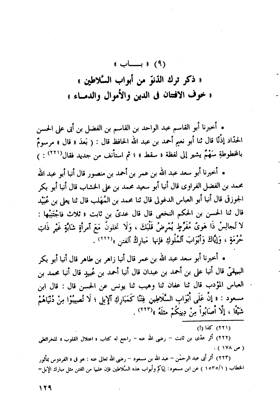 (9) : باب ذكر ترك الدنو من أبواب السلاطين خوف الافتتان في الدين والأموال والدماء