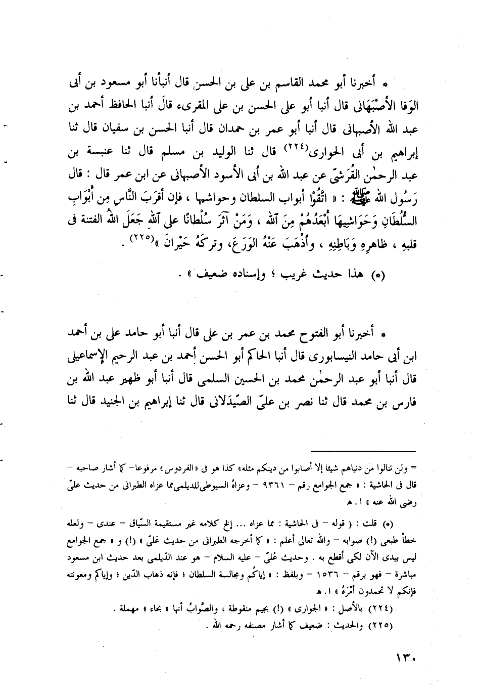 أخبرنا أبو محمد القاسم بن علي بن الحسن، قال أنبأنا أبو مسعود بن أبي الوفا الأصبهاني، قال: أنبا أبو علي الحسن بن علي المقرئ، قال: أنبا الحافظ أحمد بن عبد الله الأصبهاني، قال: أنبا أبو عمر بن حمدان، قال: أنبا الحسن بن سفيان، قال: ثنا إبراهيم بن أبي الحواري، قال: ثنا الوليد بن مسلم، قال: ثنا عنبسة بن عبد الرحمن القرشي، عن عبد الله بن أبي الأسود الأصبهاني، عن ابن عمر قال: قال رسول الله صلى الله عليه وسلم: «اتقوا أبواب السلطان وحواشيها، فإن أقرب الناس من أبواب السلطان وحواشيها أبعدهم من الله، ومن آثر سلطانا على الله جعل الله الفتنة في قلبه، ظاهره وباطنه، وأذهب عنه الورع، وتركه حيران» .