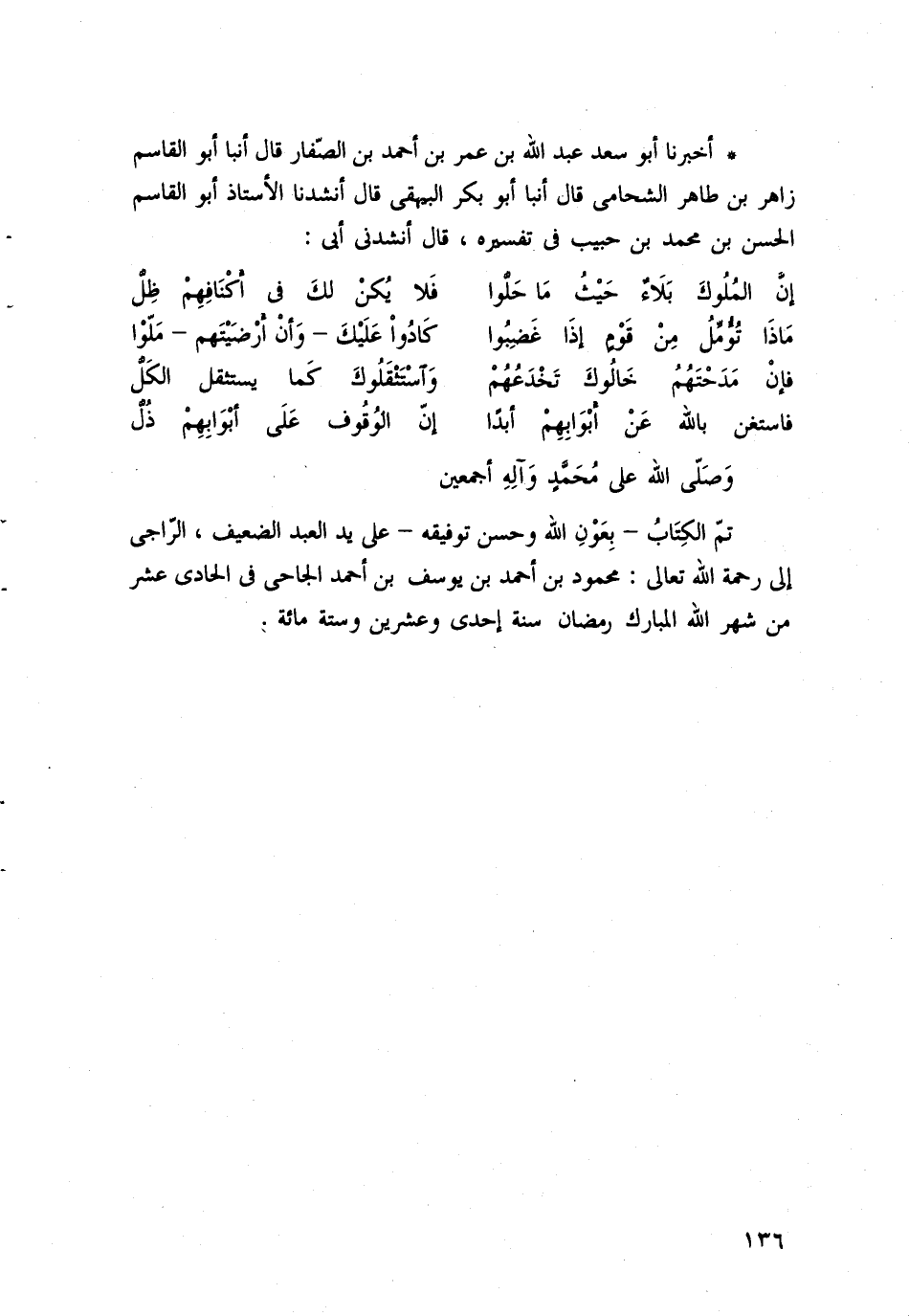 أخبرنا أبو سعد عبد الله بن عمر بن أحمد بن الصفار، قال: أنبا أبو القاسم زاهر بن طاهر الشحامي، قال: أنبا أبو بكر البيهقي، قال: أنشدنا الأستاذ أبو القاسم الحسن بن محمد بن حبيب في تفسيره، قال أنشدني أبي: