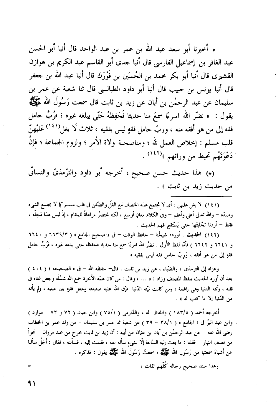 أخبرنا أبو سعد عبد الله بن عمر بن عبد الواحد، قال: أنبا أبو الحسن عبد الغافر بن إسماعيل الفارسي، قال: أنبا جدي أبو القاسم عبد الكريم بن هوازن القشيري، قال: أنبا أبو بكر محمد بن الحسين بن فورك، قال: أنبا عبد الله بن جعفر، قال: أنبا يونس بن حبيب، قال: أنبا أبو داود الطيالسي، قال: ثنا شعبة، عن عمر بن سليمان، عن عبد الرحمن بن أبان، عن زيد بن ثابت، قال: سمعت رسول الله صلى الله عليه وسلم يقول: " نضر الله امرءا سمع منا حديثا فحفظه حتى يبلغه غيره؛ فرب حامل فقه إلى من هو أفقه منه، ورب حامل فقه ليس بفقيه، ثلاث لا يغل عليهن قلب مسلم: إخلاص العمل لله؛ ومناصحة ولاة الأمر؛ ولزوم الجماعة؛ فإن دعوتهم تحيط من ورائهم «.