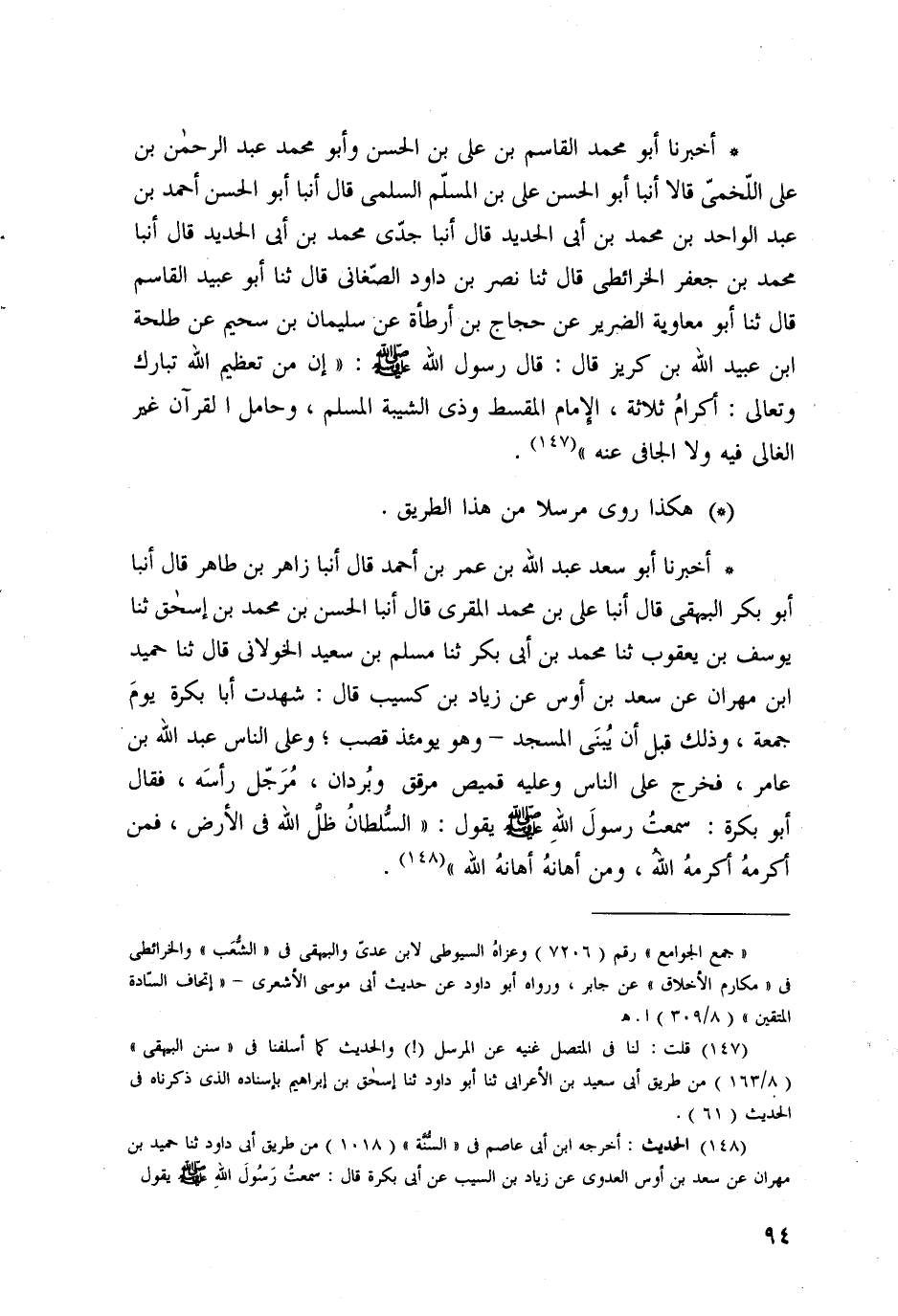 أخبرنا أبو محمد القاسم بن علي بن الحسن، وأبو محمد عبد الرحمن بن علي اللخمي، قالا: أنبا أبو الحسن علي بن المسلم السلمي، قال: أنبا أبو الحسن أحمد بن عبد الواحد بن محمد بن أبي الحديد، قال: أنبا جدي محمد بن أبي الحديد، قال: أنبا محمد بن جعفر الخرائطي، قال: ثنا نصر بن داود الصغاني، قال: ثنا أبو عبيد القاسم، قال: ثنا أبو معاوية الضرير، عن حجاج بن أرطأة، عن سليمان بن سحيم، عن طلحة بن عبيد الله بن كريز قال: قال رسول الله صلى الله عليه وسلم: " إن من تعظيم الله تبارك وتعالى: أكرام ثلاثة: الإمام المقسط وذي الشيبة المسلم، وحامل القرآن غير الغالي فيه ولا الجافي عنه ".