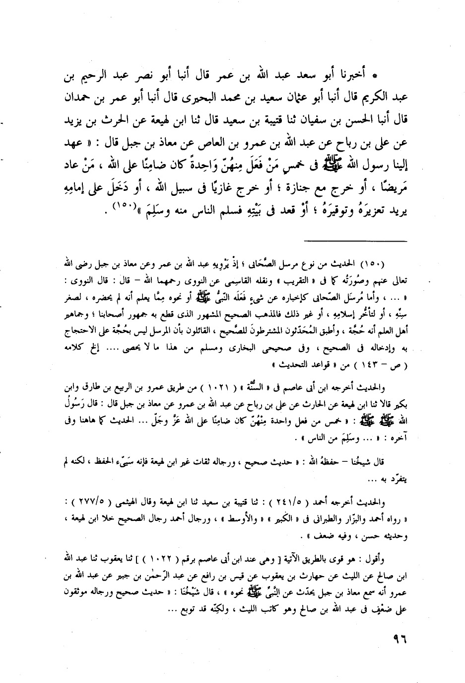 أخبرنا أبو سعد عبد الله بن عمر، قال: أنبا أبو نصر عبد الرحيم بن عبد الكريم، قال: أنبا أبو عثمان سعيد بن محمد البحيري، قال: أنبا أبو عمر بن حمدان، قال: أنبا الحسن بن سفيان، ثنا قتيبة بن سعيد، قال: ثنا ابن لهيعة، عن الحرث بن يزيد، عن علي بن رباح، عن عبد الله بن عمرو بن العاص، عن معاذ بن جبل قال: " عهد إلينا رسول الله صلى الله عليه وسلم في خمس: من فعل منهن واحدة كان ضامنا على الله، من عاد مريضا، أو خرج مع جنازة؛ أو خرج غازيا في سبيل الله، أو دخل على إمامه يريد تعزيره وتوقيره؛ أو قعد في بيته فسلم الناس منه وسلم ".