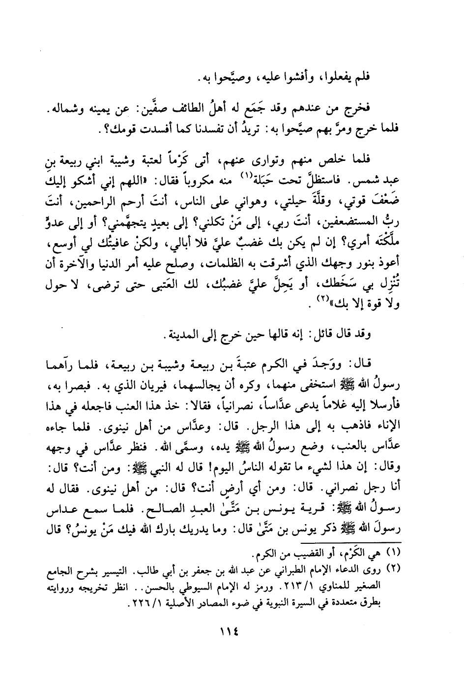 فَلَمْ يَفْعَلُوا، وَأَفْشُوا عَلَيْهِ، وَصَيَّحُوا بِهِ، فَخَرَجَ مِنْ عِنْدِهِمْ وَقَدْ جَمَعَ لَهُ أَهْلُ الطَّائِفِ صَفَّيْنِ: عَنْ يَمِينِهِ وَشِمَالِهِ، فَلَمَّا خَرَجَ وَمَرَّ بِهِمْ صَيَّحُوا بِهِ: تُرِيدُ أَنْ تُفْسِدَنَا كَمَا أَفْسَدْتَ قَوْمَكَ؟ فَلَمَّا خَلَصَ مِنْهُمْ وَتَوَارَى عَنْهُمْ، أَتَى كَرْمًا لِعُتْبَةَ وَشَيِبَةَ ابْنَيْ رَبِيعَةَ بْنِ عَبْدِ شَمْسٍ، فَاسْتَظَلَّ تَحْتَ حَبَلَةٍ مِنْهُ مَكْرُوبًا، فَقَالَ: «اللَّهُمَّ إِنِّي أَشْكُو إِلَيْكَ ضَعْفَ قُوَّتِي، وَقِلَّةَ حِيلَتِي، وَهَوَانِي عَلَى النَّاسِ، أَنْتَ أَرْحَمُ الرَّاحِمِينَ، أَنْتَ رَبُّ الْمُسْتَضْعَفِينَ، أَنْتَ رَبِّي، إِلَى مَنْ تَكِلُنِي؟ إِلَى بَعِيدٍ يَتَجَهَّمُنِي؟ أَوْ إِلَى عَدُوٍّ مَلَّكْتَهُ أَمْرِي؟ إِنْ لَمْ يَكُنْ بِكَ غَضَبٌ عَلَيَّ فَلا أُبَالِي، وَلَكِنْ عَافِيَتُكَ لِي أَوْسَعُ، أَعُوذُ بِنُورِ وَجْهِكَ الَّذِي أَشْرَقَتْ بِهِ الظُّلُمَاتُ، وَصَلُحَ عَلَيْهِ أَمْرُ الدُّنْيَا وَالآخِرَةِ أَنْ تُنْزِلَ بِي سَخَطَكَ، أَوْ يَحِلَّ عَلِيَّ غَضَبُكَ، لَكَ الْعُتْبَى حَتَّى تَرْضَى، لا حَوْلَ وَلا قُوَّةَ إِلا بِكَ» .