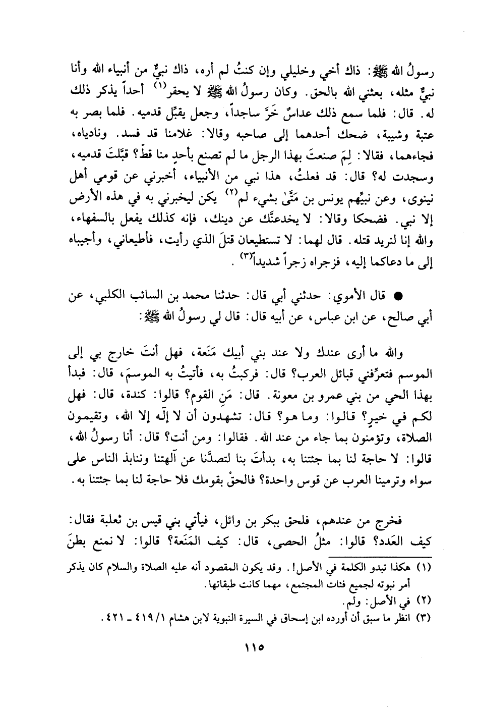قَالَ: «مَنِ الْقَوْمُ؟» , قَالُوا: كِنْدَةَ، قَالَ: «فَهَلْ لَكُمْ فِي خَيْرٍ؟» , قَالُوا: وَمَا هُوَ؟ قَالَ: «تَشْهَدُونَ أَنَّ لا إِلَهَ إِلَّا اللَّهُ، وَتُقِيمُونَ الصَّلَاةَ، وَتُؤْمِنُونَ بِمَا جَاءَ مِنْ عِنْدِ اللَّهِ» ، فَقَالُوا: وَمَنْ أَنْتَ؟ قَالَ: «أَنَا رَسُولُ اللَّهِ» ، قَالُوا: لا حَاجَةَ لَنَا بِمَا جِئْتَنَا بِهِ، بَدَأْتَ بِنَا لِتَصُدَّنَا عَنْ آلِهَتِنَا وَنُنَابِذُ النَّاسَ عَلَى سَوَاءٍ وَتَرْمِينَا الْعَرَبُ عَنْ قَوْسٍ وَاحِدَةٍ؟ فَالْحَقْ بِقَوْمِكَ فَلا حَاجَةَ لَنَا بِمَا جِئْتَنَا بِهِ، فَخَرَجَ مِنْ عِنْدِهِمْ، فَلَحِقَ بِبَكْرِ بْنِ وَائِلٍ، فَيَأْتِي بَنِي قَيْسِ بْنِ ثَعْلَبَةَ، فَقَالَ: «كَيْفَ الْعَدَدُ؟» , قَالُوا: مِثْلُ الْحَصَى، قَالَ: «كَيْفَ الْمَنَعَةُ؟» , قَالُوا: لا نَمْنَعُ بَطْنَ
