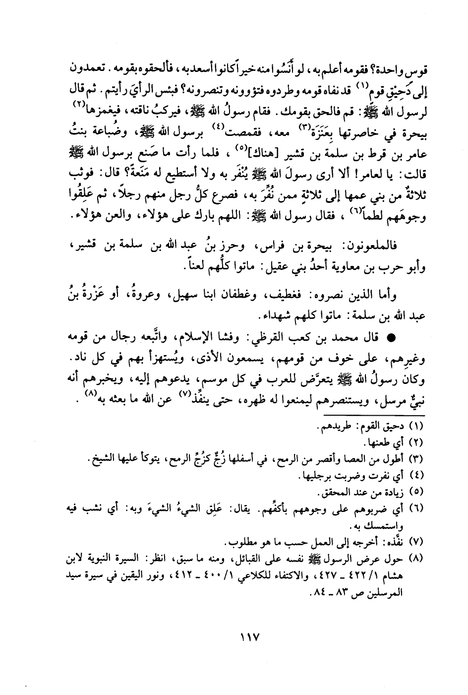 قَوْسٍ وَاحِدَةٍ؟ فَقَوْمُهُ أَعْلَمُ بِهِ، لَوْ أَنِسُوا مِنْهُ خَيْرًا كَانُوا أَسْعَدَ بِهِ، فَأَلْحِقُوهُ بِقَوْمِهِ، تَعْمِدُونَ إِلَى دَحِيقِ قَوْمٍ قَدْ نَفَاهُ قَوْمُهُ وَطَرَدُوهُ، فَتُئْونَهُ وَتَنْصُرُونَهُ؟ فَبِئْسَ الرَّأْيَ رَأَيْتُمْ، ثُمَّ قَالَ لِرَسُولِ اللَّهِ صَلَّى اللَّهُ عَلَيْهِ وَسَلَّمَ: قُمْ فَالْحَقْ بِقَوْمِكَ، فَقَامَ رَسُولُ اللَّهِ صَلَّى اللَّهُ عَلَيْهِ وَسَلَّمَ، فَيَرْكَبُ نَاقَتَهُ، فَيَغْمِزُهَا بَيْحَرَةُ فِي خَاصِرَتِهَا بِعَنَزَةٍ مَعَهُ، فَقَمَصَتْ بِرَسُولِ اللَّهِ صَلَّى اللَّهُ عَلَيْهِ وَسَلَّمَ، وَضُبَاعَةُ بِنْتُ عَامِرِ بْنِ قُرْطِ بْنِ سَلَمَةَ بْنِ قُشَيْرٍ هُنَاكَ، فَلَمَّا رَأَتْ مَا صَنَعَ بِرَسُولِ اللَّهِ صَلَّى اللَّهُ عَلَيْهِ وَسَلَّمَ قَالَتْ: يَا لَعَامِرٍ! أَلا أَرَى رَسُولَ اللَّهِ صَلَّى اللَّهُ عَلَيْهِ وَسَلَّمَ يُنْفَرُ بِهِ وَلا أَسْتَطِيعُ لَهُ مَنَعَةً؟ قَالَ: فَوَثَبَ ثَلاثَةٌ مِنْ بَنِي عَمِّهَا إِلَى ثَلاثَةٍ مِمَّنْ نُفِّرَ بِهِ، فَصَرَعَ كُلُّ رَجُلٍ مِنْهُمْ رَجُلا، ثُمَّ عَلِقُوا وُجُوهَهُمْ لَطْمًا، فَقَالَ رَسُولُ اللَّهِ صَلَّى اللَّهُ عَلَيْهِ وَسَلَّمَ: «اللَّهُمَّ بَارِكْ عَلَى هَؤُلاءِ، وَالْعَنْ هَؤُلاءِ» ، فَالْمَلْعُونُونَ: بَيْحَرَةُ بْنُ فِرَاسٍ، وَحِرْزُ بْنُ عَبْدِ اللَّهِ بْنَ سَلَمَةَ بْنِ قُشَيْرٍ، وَأَبُو حَرْبِ بْنِ مُعَاوِيَةَ أَحَدُ بَنِي عَقِيلٍ: مَاتُوا كُلُّهُمْ لَعْنًا، وَأَمَّا الَّذِينَ نَصَرُوهُ: فَغُطَيْفٍ، وَغَطْفَانُ ابْنَا سُهَيْلٍ، وَعُرْوَةُ، أَوْ عَزْرَةُ بْنُ عَبْدِ اللَّهِ بْنِ سَلَمَةَ: مَاتُوا كُلُّهُمْ شُهَدَاءَ.