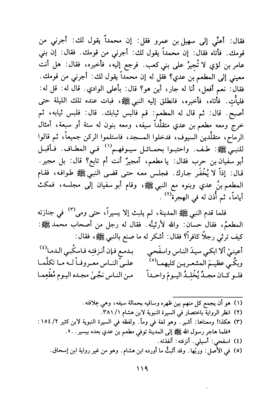 قَالَ: إِذًا لا يُخْفَرُ جَارُكَ، فَجَلَسَ مَعَهُ حَتَّى قَضَى النَّبِيُّ صَلَّى اللَّهُ عَلَيْهِ وَسَلَّمَ طَوَافَهُ، فَقَامَ الْمُطْعِمُ بْنُ عَدِيٍّ وَبَنُوهُ مَعَ النَّبِيِّ صَلَّى اللَّهُ عَلَيْهِ وَسَلَّمَ، وَقَامَ أَبُو سُفْيَانَ إِلَى مَجْلِسِهِ، فَمَكَثَ أَيَّامًا، ثُمَّ أُذِنَ لَهُ فِي الْهِجْرَةِ، فَلَمَّا قَدِمَ النَّبِيُّ صَلَّى اللَّهُ عَلَيْهِ وَسَلَّمَ الْمَدِينَةَ، لَمْ يَلْبَثُ إِلا يَسِيرًا، حَتَّى وَمِيَ فِي جِنَازَتِهِ الْمُطْعِمُ، فَقَالَ حَسَّانُ: وَاللَّهِ لأَرْثِيَنَّهُ.