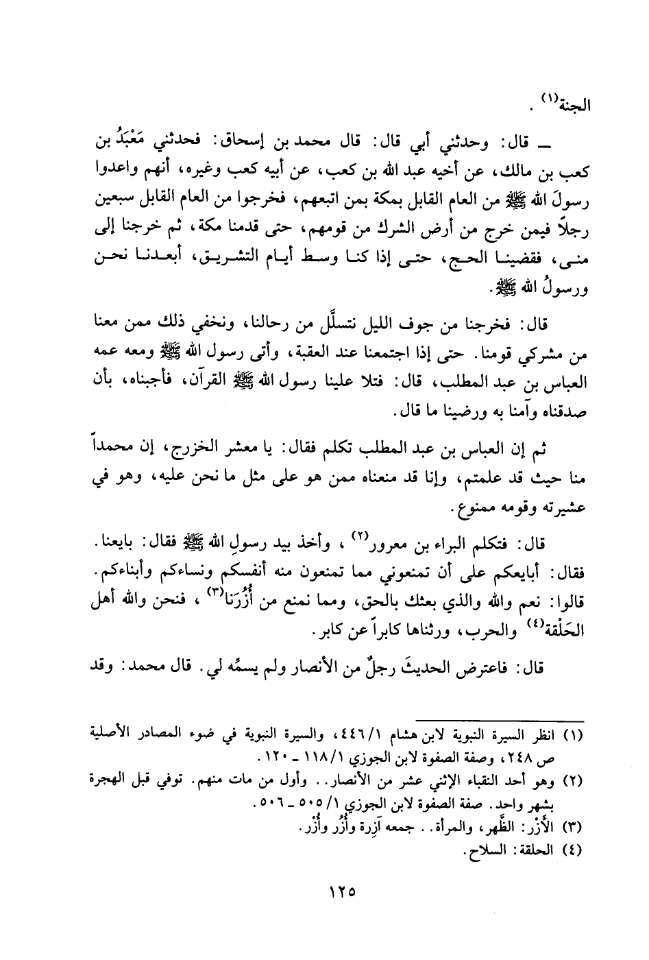 قَالَ: وَحَدَّثَنِي أَبِي، قَالَ: قَالَ مُحَمَّدُ بْنُ إِسْحَاقَ: فَحَدَّثَنِي مَعْبَدُ بْنُ كَعْبِ بْنِ مَالِكٍ، عَنْ أَخِيهِ عَبْدِ اللَّهِ بْنِ كَعْبٍ، عَنْ أَبِيهِ كَعْبٍ، وَغَيْرِهِ، إِنَّهُمْ وَاعَدُوا رَسُولَ اللَّهِ صَلَّى اللَّهُ عَلَيْهِ وَسَلَّمَ مِنَ الْعَامِ الْقَابِلِ بِمَكَّةَ بِمَنِ اتَّبَعَهُمْ، فَخَرَجُوا مِنَ الْعَامِ الْقَابِلِ سَبْعِينَ رَجُلا فِيمَنْ خَرَجَ مِنْ أَرْضِ الشِّرْكِ مِنْ قَوْمِهِمْ، حَتَّى قَدِمْنَا مَكَّةَ، ثُمَّ خَرَجْنَا إِلَى مِنًى، فَقَضَيْنَا الْحَجَّ، حَتَّى إِذَا كُنَّا وَسَطَ أَيَّامِ التَّشْرِيقِ، أَبْعَدْنَا نَحْنُ وَرَسُولُ اللَّهِ صَلَّى اللَّهُ عَلَيْهِ وَسَلَّمَ، قَالَ: فَخَرَجْنَا مِنْ جَوْفِ اللَّيْلِ نَتَسَلَّلُ مِنْ رِحَالِنَا، وَنُخْفِي ذَلِكَ مِمَّنْ مَعَنَا مِنْ مُشْرِكِي قَوْمِنَا، حَتَّى إِذَا اجْتَمَعْنَا عِنْدَ الْعَقَبَةِ، وَأَتَى رَسُولُ اللَّهِ صَلَّى اللَّهُ عَلَيْهِ وَسَلَّمَ وَمَعَهُ عَمُّهُ الْعَبَّاسُ بْنُ عَبْدِ الْمُطَّلِبِ، قَالَ: فَتَلا عَلَيْنَا رَسُولُ اللَّهِ صَلَّى اللَّهُ عَلَيْهِ وَسَلَّمَ الْقُرْآنَ، فَأَجَبْنَاهُ، بِأَنْ صَدَّقْنَاهُ وَآمَنَّا بِهِ وَرَضِينَا مَا قَالَ، ثُمَّ إِنَّ الْعَبَّاسَ بْنَ عَبْدِ الْمُطَّلِبِ تَكَلَّمَ، فَقَالَ: يَا مَعْشَرَ الْخَزْرَجِ، إِنَّ مُحَمَّدًا مِنَّا حَيْثُ قَدْ عَلِمْتُمْ، وَإِنَّا قَدْ مَنَعْنَاهُ مِمَّنْ هُوَ عَلَى مِثْلِ مَا نَحْنُ عَلَيْهِ، وَهُوَ فِي عَشِيرَتِهِ وَقَوْمِهِ مَمْنُوعٌ، قَالَ: فَتَكَلَّمَ الْبَرَاءُ بْنُ مَعْرُورٍ، وَأَخَذَ بِيَدِ رَسُولِ اللَّهِ صَلَّى اللَّهُ عَلَيْهِ وَسَلَّمَ، فَقَالَ: بَايِعْنَا، فَقَالَ: «أُبَايِعُكُمْ عَلَى أَنْ تَمْنَعُونِي مِمَّا تَمْنَعُونَ مِنْهُ أَنْفُسَكُمْ، وَنِسَاءَكُمْ، وَأَبْنَاءَكُمْ» .